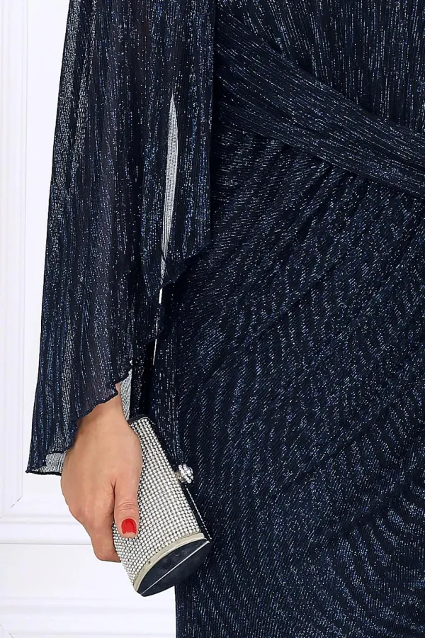 Особое внимание заслуживает рукав — лёгкий, без шва, с изящно ниспадающими краями. Его воздушность придаёт образу загадочность и утончённость, а необычный крой с драпировкой и сборкой по линии плеч делает движения пластичными и грациозными. Фигурный вырез горловины придаёт образу нотку смелости, но остаётся выдержанным и гармоничным.