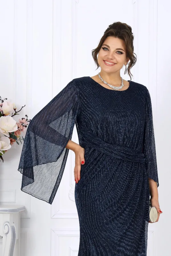 Платье женское, прилегающего силуэта с расширением к низу, выполнено из сетки-гофре с нитью «люрекс». Модель на трикотажной подкладке, без застежки, с плечевыми накладками. В верхней части переда косой подрез со сборкой; в шов подреза входит задрапированный декоративный элемент. На спинке обработаны талиевые вытачки. Вырез горловины переда и спинки округлой формы, по переду углубленный. Рукав без шва, с отлетными краями и фигурным низом, по окату сборка; крепится к пройме только в верхней части. Пройма окантована узкой косой бейкой из основного материала Длина платья – 140 см; длина рукава – 54 см.