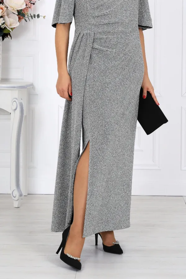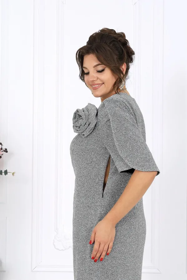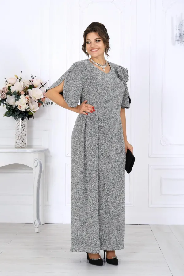 Платье женское полуприлегающего силуэта, выполнено из трикотажного полотна с фактурной лицевой стороной «люрекс». Модель на трикотажной подкладке, с плечевыми накладками. В левом боковом шве обработана застежка на потайную тесьму-«молнию» (35 см). Перед платья с горизонтальным подрезом по линии талии и отлетной деталью в шве подреза. В правой части переда обработан рельеф с разрезом в нижней части. Вдоль рельефного шва заложены односторонние складки, направленные к центру переда. Спинка с талиевыми вытачками. Горловина спинки округлая, по переду V-образная, углубленная. Рукав короткий, втачной, формы «крылышко на запах», со скругленными краями. Платье дополнено съемным «цветком» из основного полотна. Длина платья - 136 см; длина рукава - 31 см.