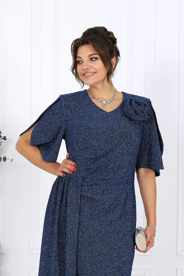 Платье женское полуприлегающего силуэта, выполнено из трикотажного полотна с фактурной лицевой стороной «люрекс». Модель на трикотажной подкладке, с плечевыми накладками. В левом боковом шве обработана застежка на потайную тесьму-«молнию» (35 см). Перед платья с горизонтальным подрезом по линии талии и отлетной деталью в шве подреза. В правой части переда обработан рельеф с разрезом в нижней части. Вдоль рельефного шва заложены односторонние складки, направленные к центру переда. Спинка с талиевыми вытачками. Горловина спинки округлая, по переду V-образная, углубленная. Рукав короткий, втачной, формы «крылышко на запах», со скругленными краями. Платье дополнено съемным «цветком» из основного полотна. Длина платья - 136 см; длина рукава - 31 см.
