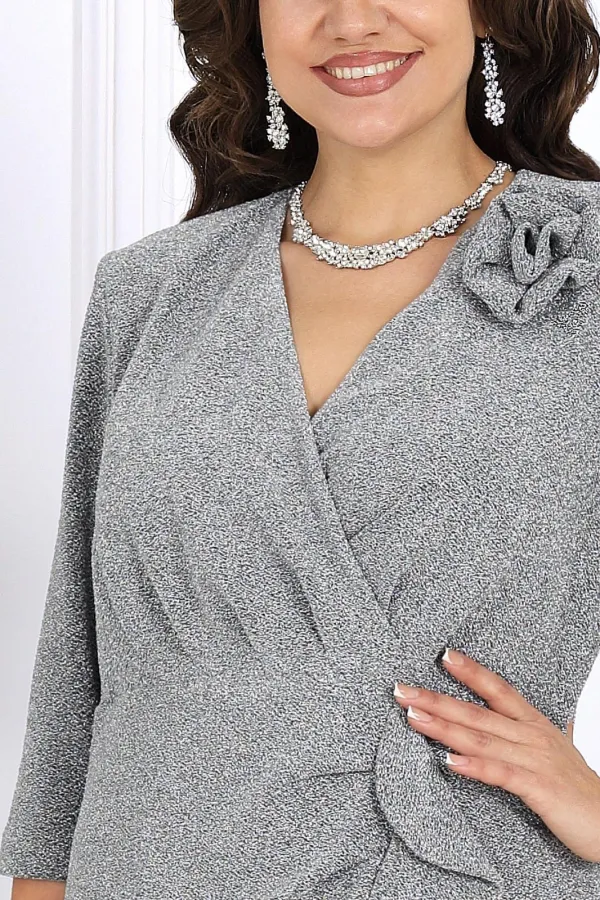 Платье женское полуприлегающего силуэта, выполнено из трикотажного полотна с фактурной лицевой стороной «люрекс». Модель на трикотажной подкладке, с плечевыми накладками и застежкой в левом боковом шве на потайную тесьму-«молнию» (35 см). Перед отрезной по линии талии. Верхняя часть переда состоит из двух деталей, скрепленных на запах; вдоль горизонтального подреза заложены односторонние складки. На нижней части переда обработан рельефный шов с двойным воланом в верхней части и разрезом по низу; от шва к центру направлены односторонние складки. На спинке обработаны талиевые вытачки. Рукав трехчетвертной. Платье дополнено съемным «цветком» из основного полотна. Длина платья – 134 см; длина рукава – 42 см.