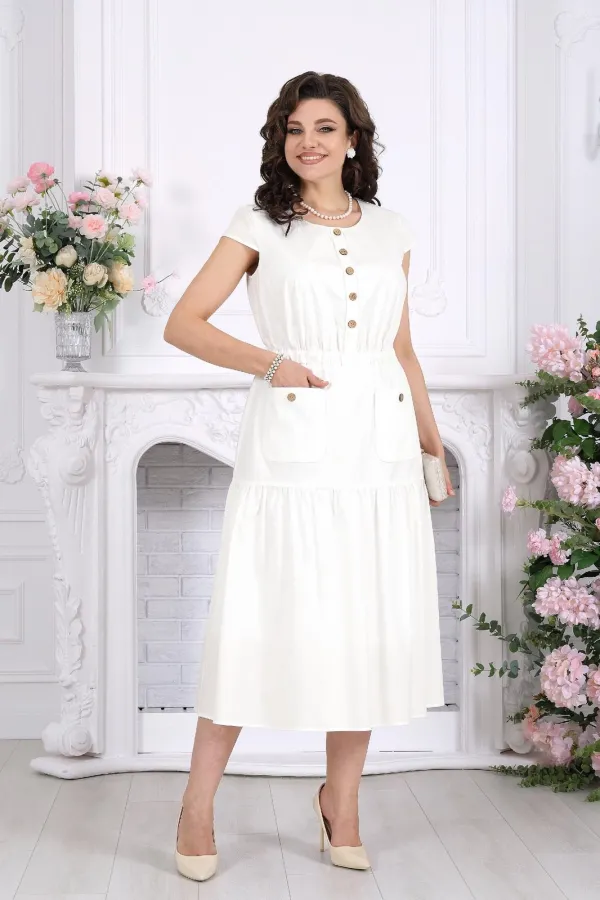 Платье женское, прямого силуэта с рукавами «крылышко». По центру лифа, имитация планки, декорирована 5 пуговицами. По лини бёдер притачной волан со сборкой. Платье выполнено из костюмно-плательной ткани на х/б подкладке. Модель отрезная по линии талии с притачной кулисой и широкой эластичной лентой внутри. На уровне линии бёдер, по переду платья, настрочены накладные карманы, верх кармана декорирован пуговицей. Длина платья – 120 см, длина рукава 8,5 см.