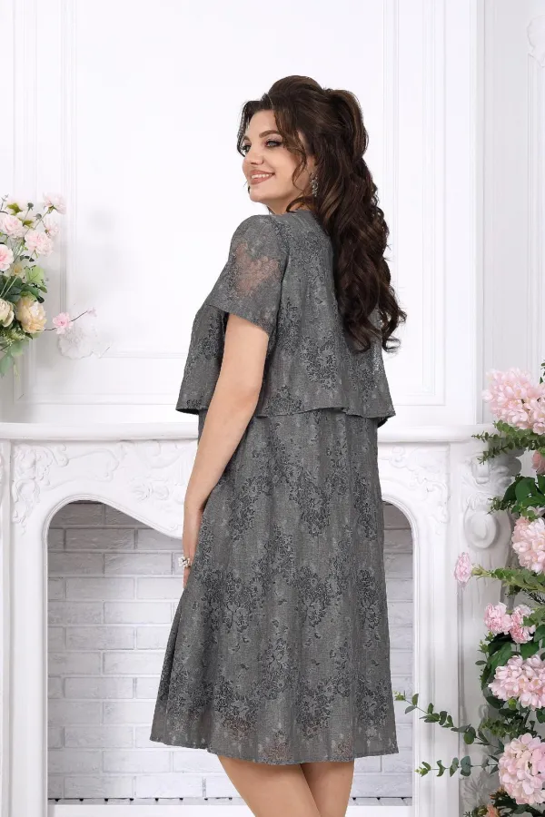 А-силуэт деликатно садится по фигуре, не сковывая движения и красиво выравнивая пропорции. Отлётной лиф добавляет глубины образу и визуально вытягивает силуэт, а кружевная фактура придаёт изысканность и дорогой вид. Натуральная хлопковая подкладка делает платье приятным к телу даже в тёплую погоду, а короткий рукав добавляет лёгкости и универсальности.