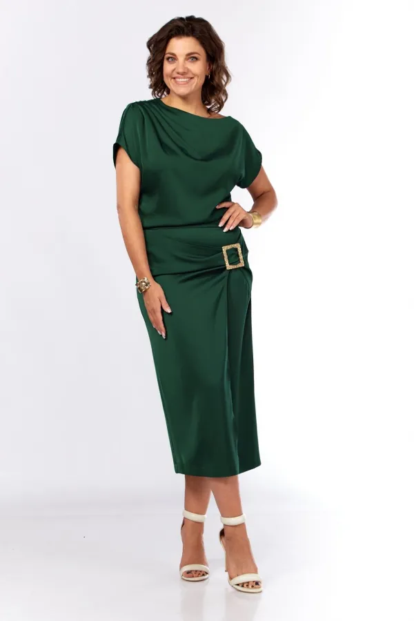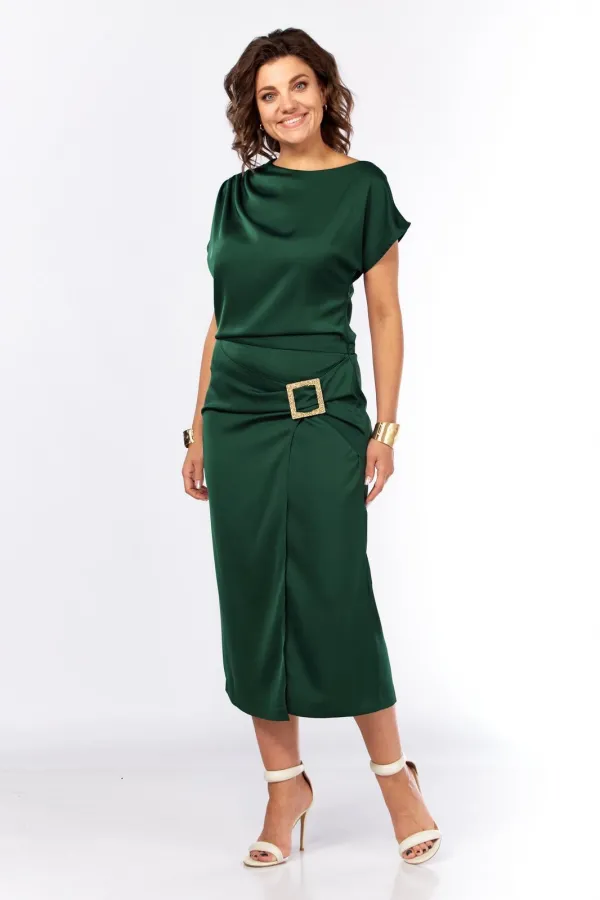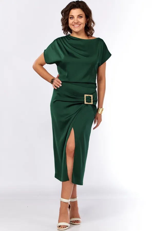 Шикарное нарядное платье, полуприлегающего силуэта из струящейся ткани с цельнокроеным рукавом, коротким, ассиметричного силуэта. Платье отрезное по талии, с молнией потайной в боковом шве. По плечевому шву по переду и спинке заложены складки. Нижняя часть с разрезом, декоративной не сьемной пряжкой. Талия присобна на резинку.