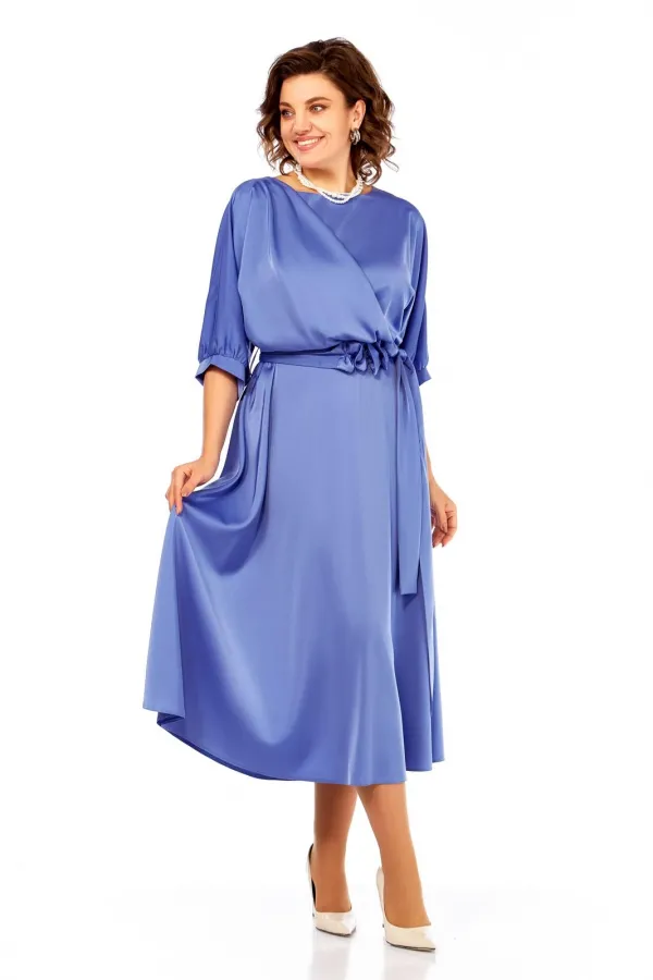 Нарядное платье из струящейся ткани, отрезное по линии талии. Верх летучая мышь, по низу рукава сборка и притачная манжета. Вырез горловины округлой формы. По переду ассиметричная деталь от плеча до линии подреза. По линии подреза резинка. Нижняя часть платья клеш. К платью прилагается интересный пояс, украшенный стразами.