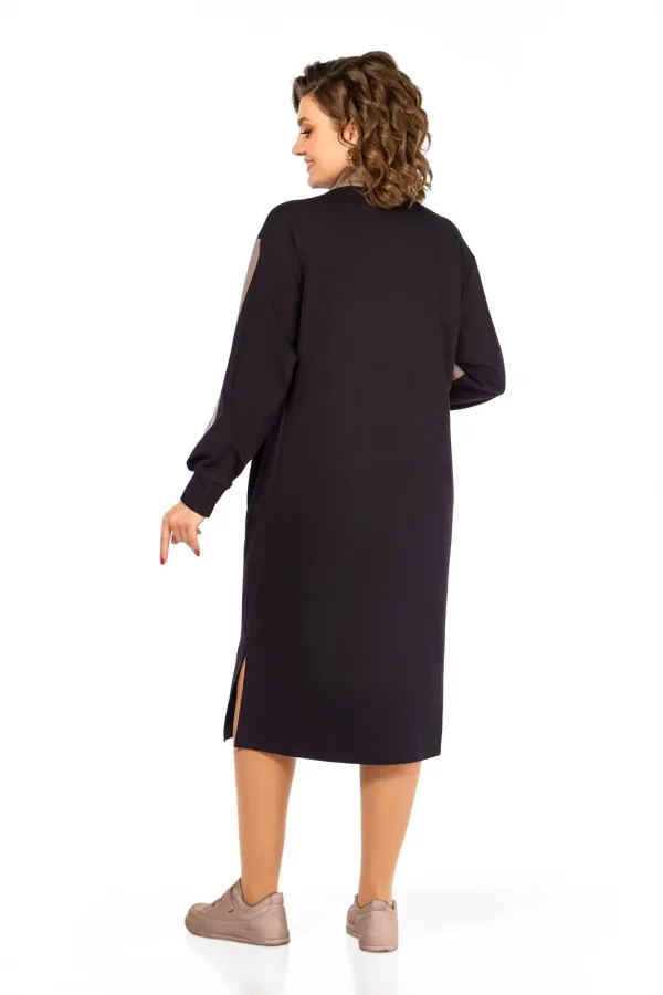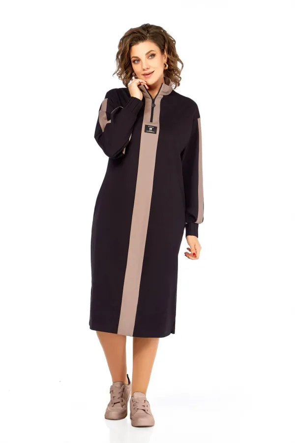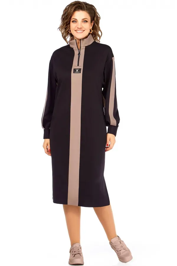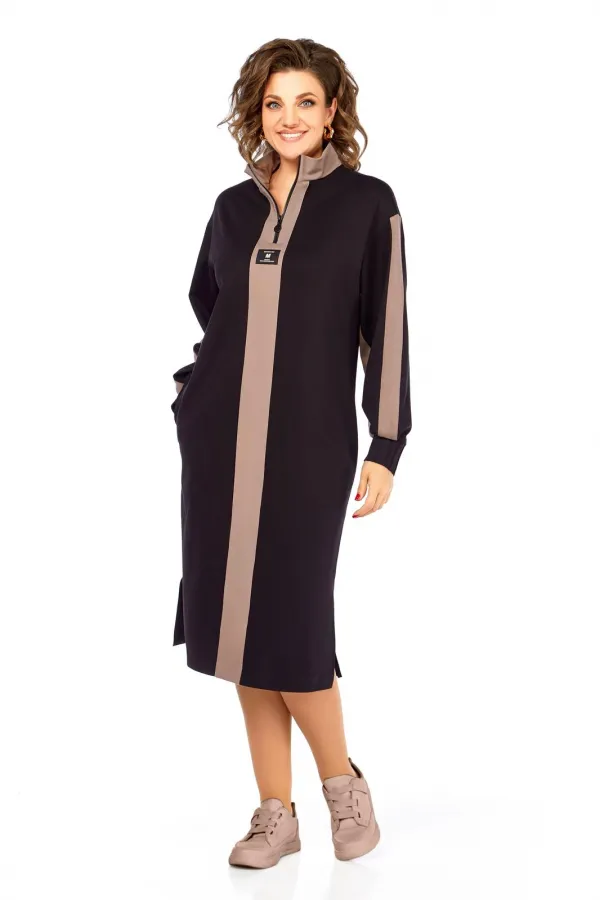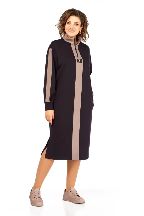 Платье в стиле спорт-шик прямого силуэта, с воротником-стойкой. По переду, по центру контрастная отделка, молния, переходящая в воротник, декоративная нашивка. В боковых швах карманы и разрезы в низу. Рукав апущенный на манжете, с контрастными полосками.