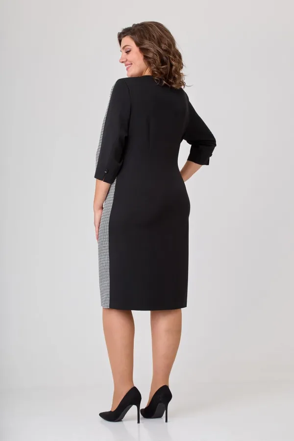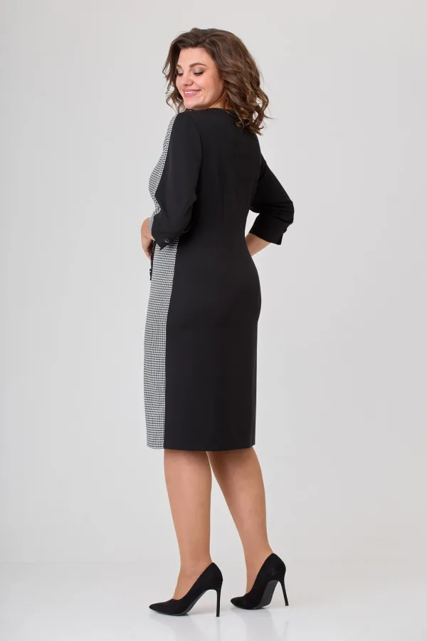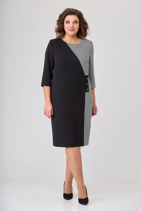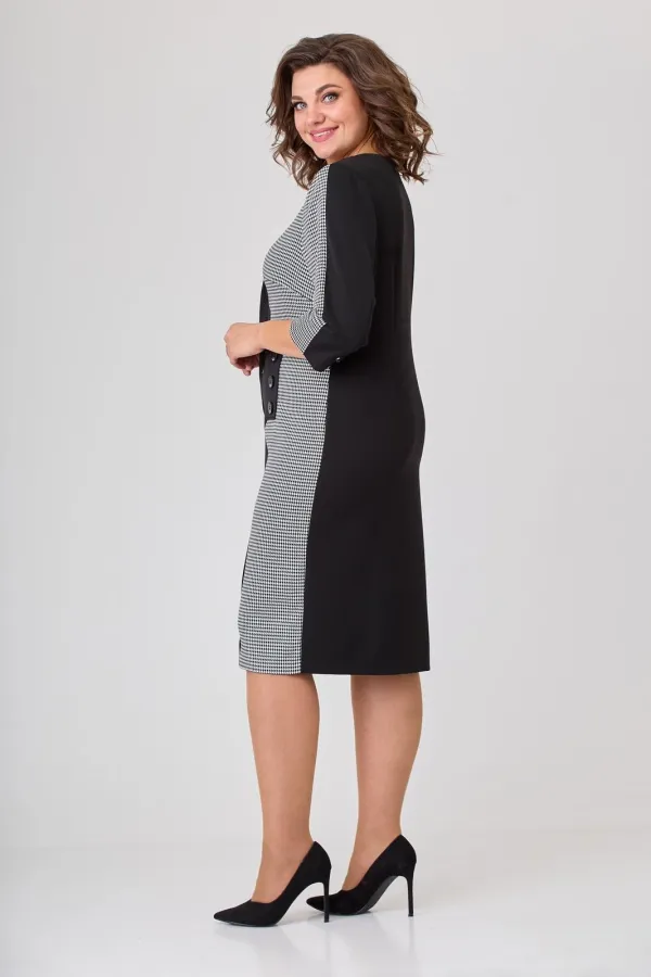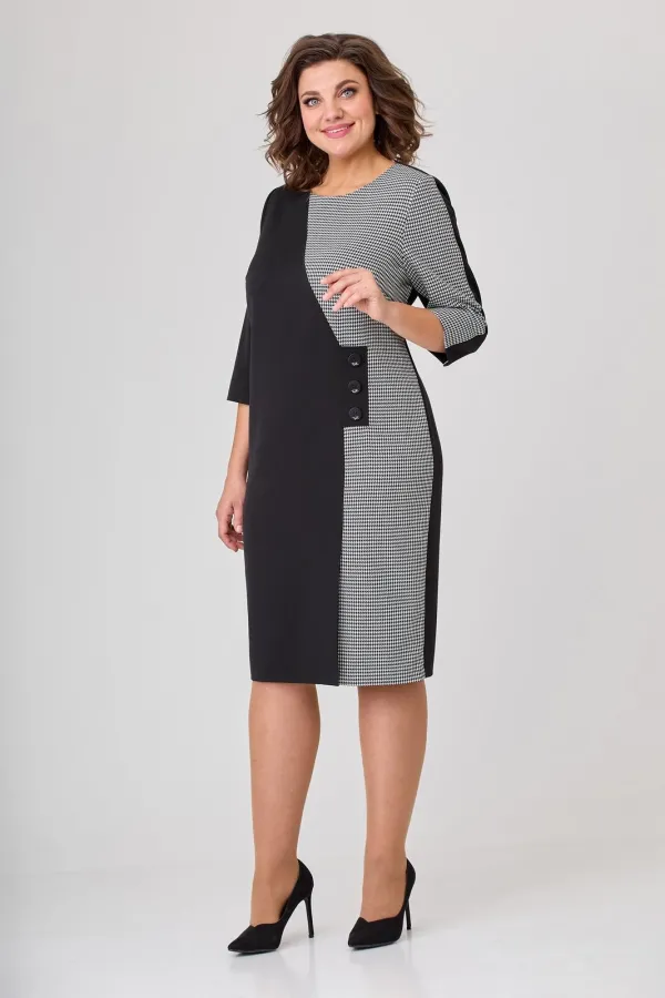 Платье женское полуприлегающего силуэта, втачного покроя. Платье выполнено из двух видов ткани: однотонной (плательно-костюмной группы) и черно-белой отделочной. Горловина в платье округлой формы. Рукава двушовные с разрезом по локтевому шву. Длина рукава ¾. Левый рукав с центральным швом в верхней части рукава.  Верхняя центральная часть рукава выполнена из отделочной ткани в поддержку левой боковой части переда, правая часть переда выполнена из однотонной плательной ткани. Шов, соединяющий эти части переходит в имитацию застежки на три пуговицы и далее переходит в шлицу. Спинка цельная с вертикальными талиевыми вытачками. На рукаве над разрезами пришиты декоративные пуговицы.