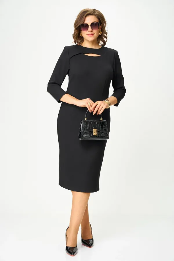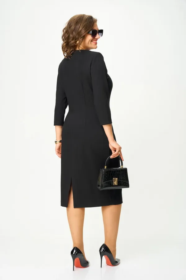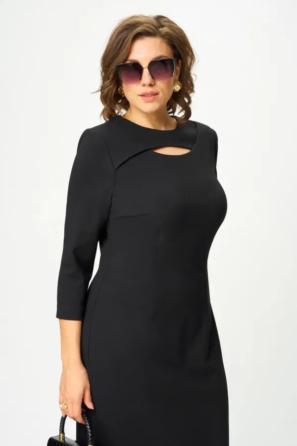 Платье женское, полуприлегающего силуэта, втачного покроя рукава, выполнено из трикотажного полотна. По переду расположены талиевые и нагрудные вытачки, горловина округлой формы с пересекающейся кокеткой, которая образует фигурный вырез. Спинка со средним швом, заканчивающимся разрезом снизу и застегивающимся на навесную петлю-пуговицу сверху, а так же талиевые вытачки. Рукава ¾ одношовные.