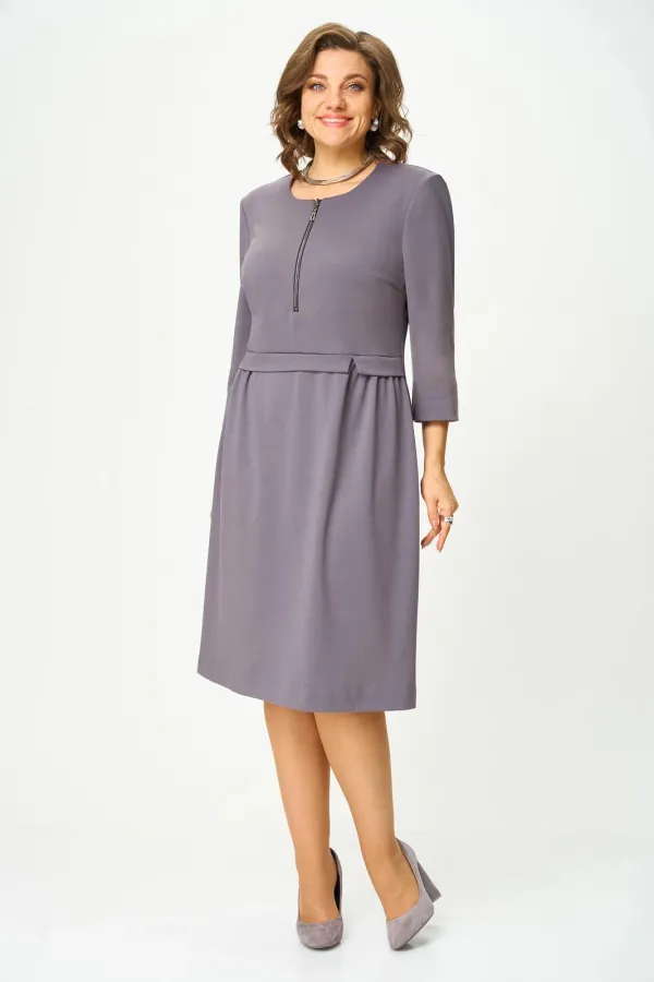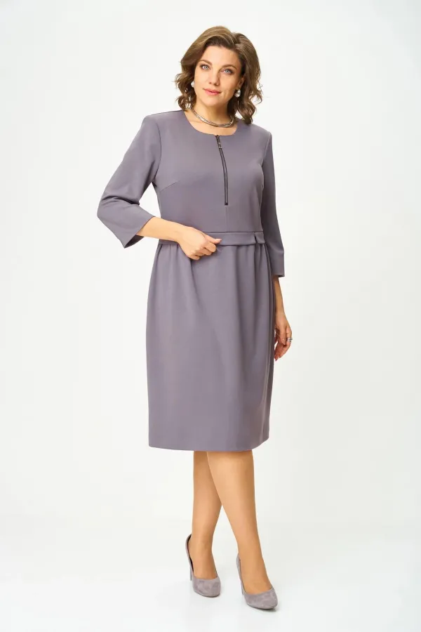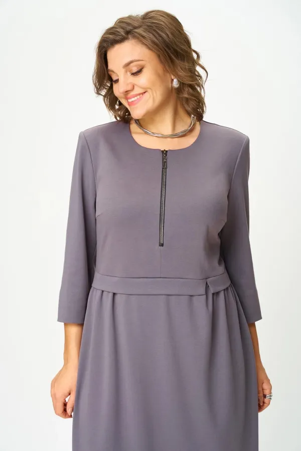 Платье женское полуприлегающего силуэта, втачного покроя рукава, выполнено из трикотажного полотна. По переду платье отрезное по линии талии, в шов вставлена горизонтальная планка, с уголком в левой части. Нижняя часть переда на сборке в боковых частях. Верхняя часть переда со швом по центру, в который вставлена отделочная молния, а так же с нагрудными вытачками из боковых швов. Горловина округлой формы. Спинка со средним швом и талиевыми вытачками. Рукав ¾ двухшовный, с небольшим разрезом по локтевому шву.