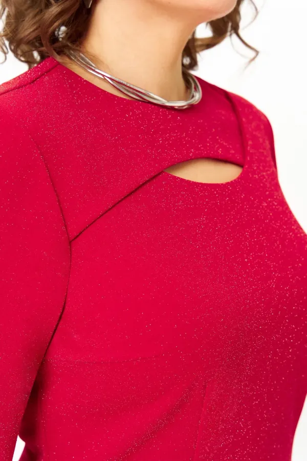 Платье женское, полуприлегающего силуэта, втачного покроя рукава, выполнено из трикотажного полотна с люрексовой нитью. По переду расположены талиевые и нагрудные вытачки, горловина округлой формы с пересекающейся кокетк... Читать далее...