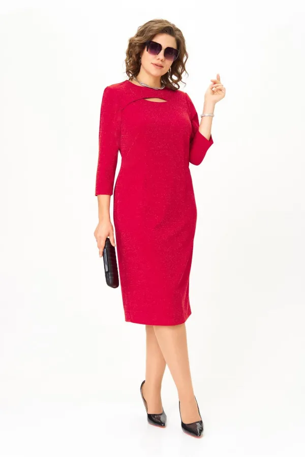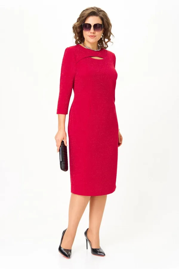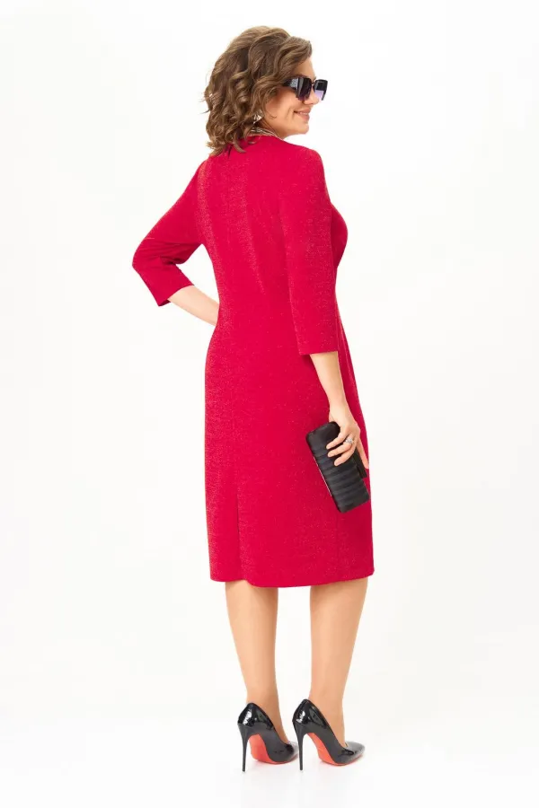 Платье женское, полуприлегающего силуэта, втачного покроя рукава, выполнено из трикотажного полотна с люрексовой нитью. По переду расположены талиевые и нагрудные вытачки, горловина округлой формы с пересекающейся кокеткой, которая образует фигурный вырез. Спинка со средним швом, заканчивающимся разрезом снизу и застегивающимся на навесную петлю-пуговицу сверху, а так же талиевые вытачки. Рукава ¾ одношовные.