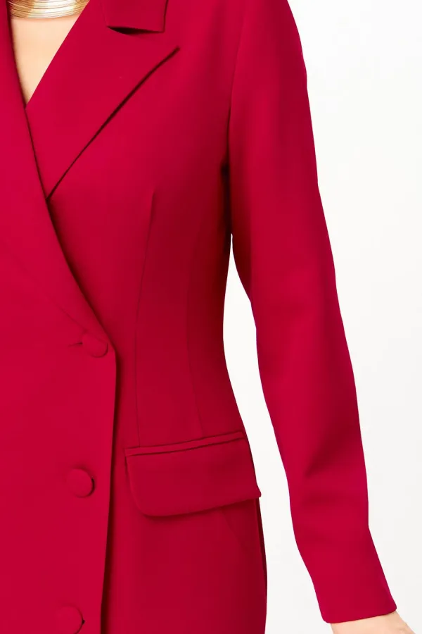 Платье женское, полуприлегающего силуэта, зауженное к низу, с двубортной застежкой на 3 отделочные пуговицы. Правая часть платья имеет слегка наклонную линию. На спинке средний шов, заканчивающийся шлицей и талиевые вытачки. По переду отрезной бочок, заканчивающийся в области бедер и нагрудная вытачка в горизонтальном подрезе, в котором выполнен прорезной карман с двумя рамками и клапаном. Горловина оформлена воротником пиджачного типа. Рукав втачной, одношовный, длинный.