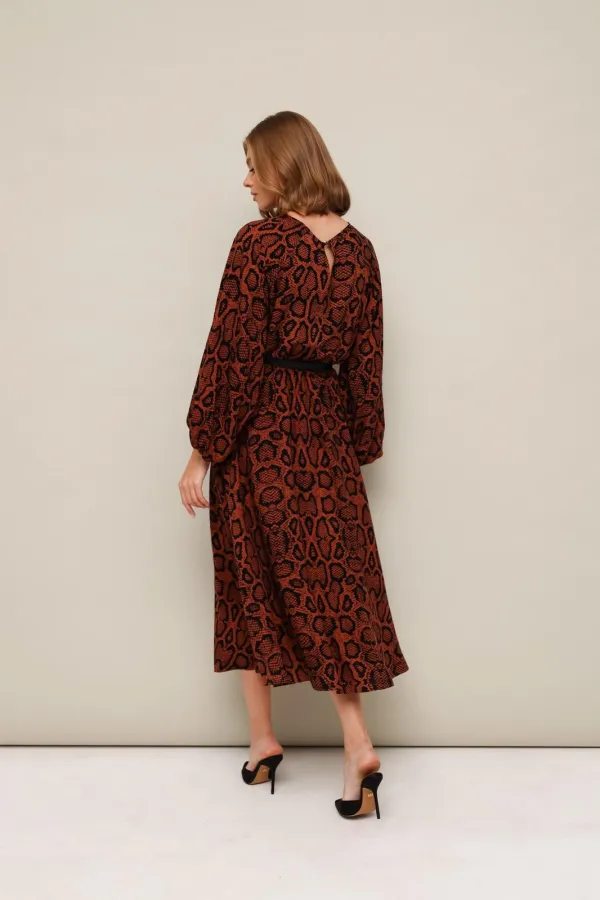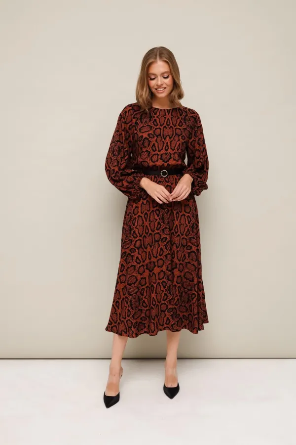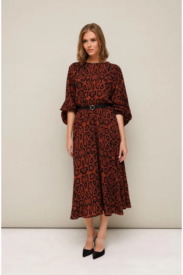 Платье отрезное по линии талии на резинке, выполнено из вискозы с принтом рептилии. Горловина с окантованным вырезом круглой формы. Рукава-реглан, в длине 3/4 собраны на резинку по низу. По спинке обработан разрез с застежкой в среднем шве на навесную петлю и пуговицу. В комплекте прилагается съемный ремень.