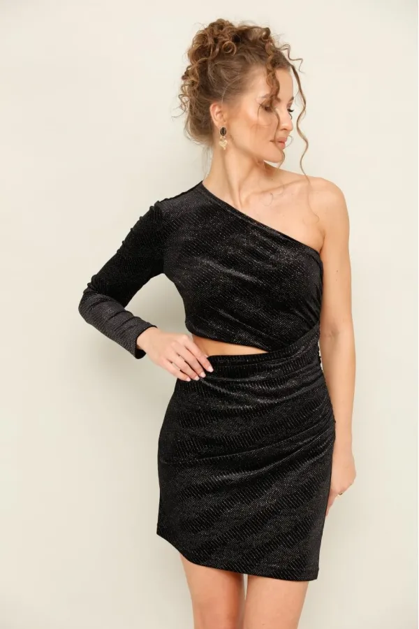 Платье прилегающего силуэта, с боковым вырезом. Ткань велюр с напылением блесток.