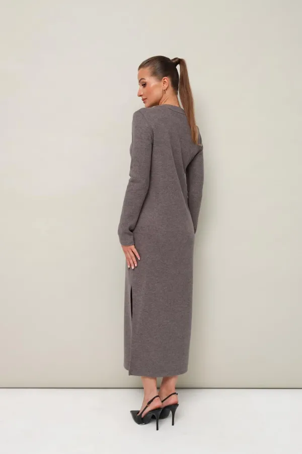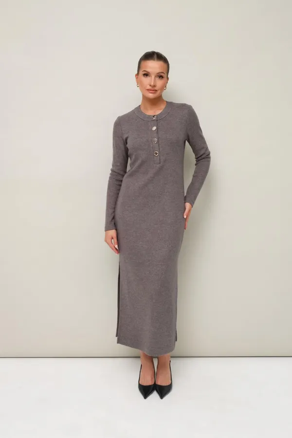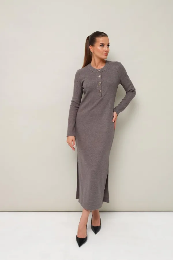 Стильное платье полуприлегающего силуэта, выполнено из трикотажного полотна. Горловина округлой формы, с центральной застежкой на петли и 4 разных пуговицы. Рукава длинные втачные. В боковых швах обработаны высокие разрезы.