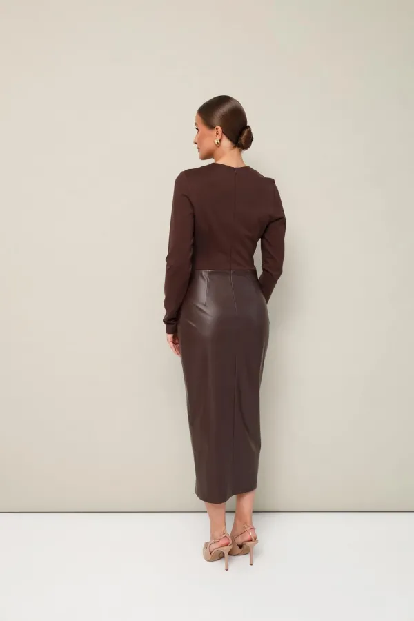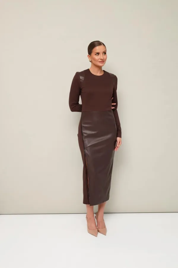 Стильное платье прилегающего силуэта, отрезное по линии талии, выполнено из экокожи и трикотажного полотна. Горловина округлой формы. Длинные втачные рукава. Юбка спереди с подрезом на металлическую молнию, с возможностью регулировать высоту разреза. Застёжка по спинке в среднем шве на потайную молнию.