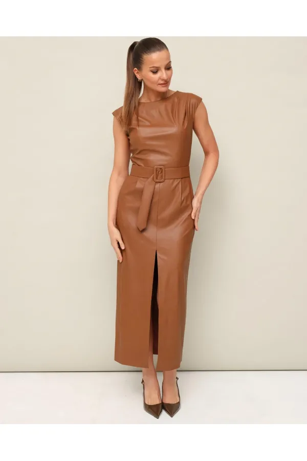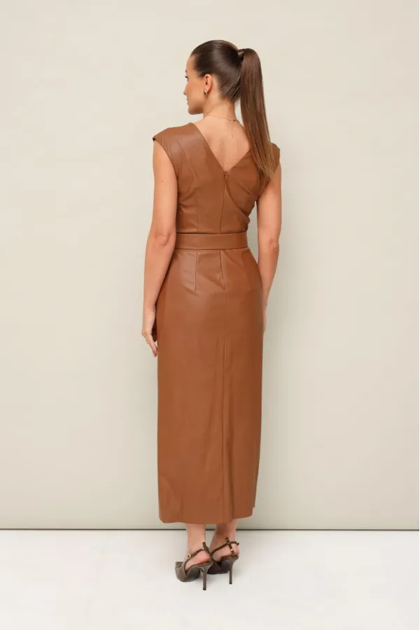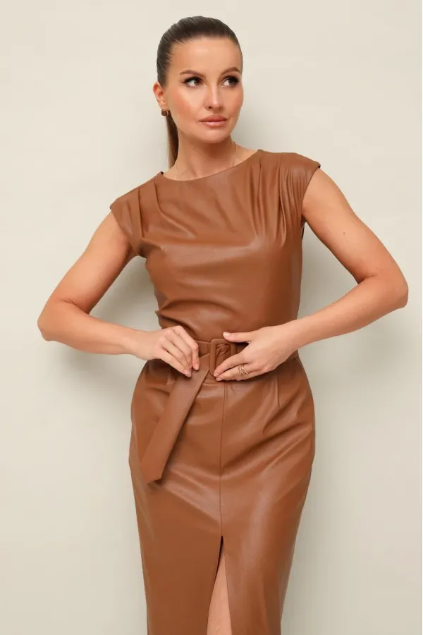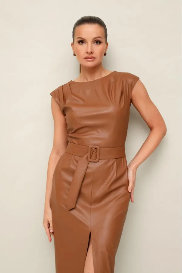 Стильное платье отрезное по линии талии в длине миди, выполнено из экокожи. Округлый вырез горловины. По плечевым швам лифа и по талии обработаны защипы. Юбка со средним швом, переходящим в разрез. Спинка в V-образным вырезом. В среднем шве застёжка на потайную тесьму молнию. В комплекте прилагается пояс из основной ткани с обтяжной пряжкой.
