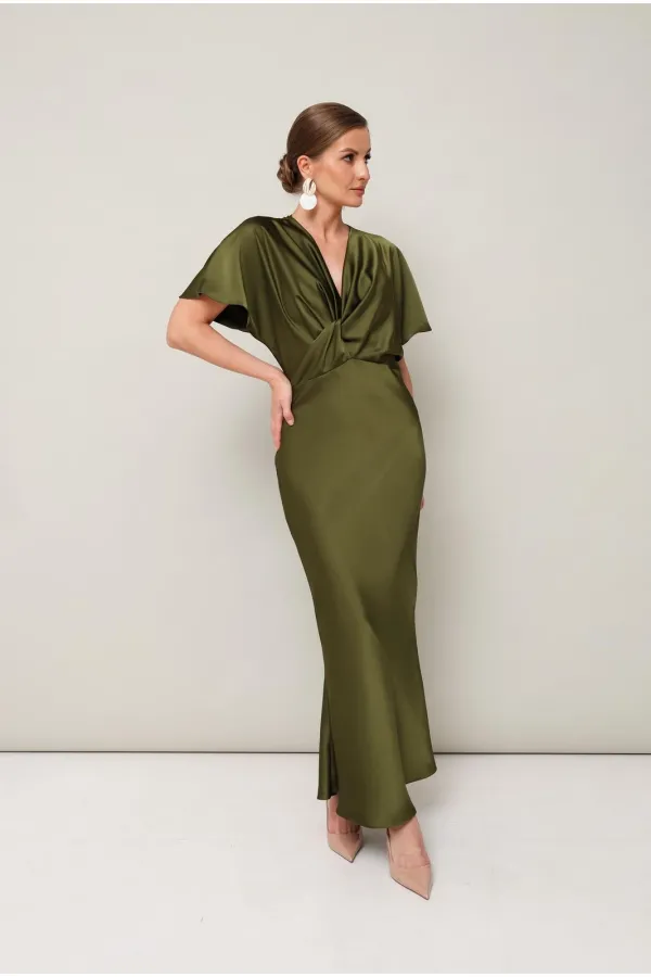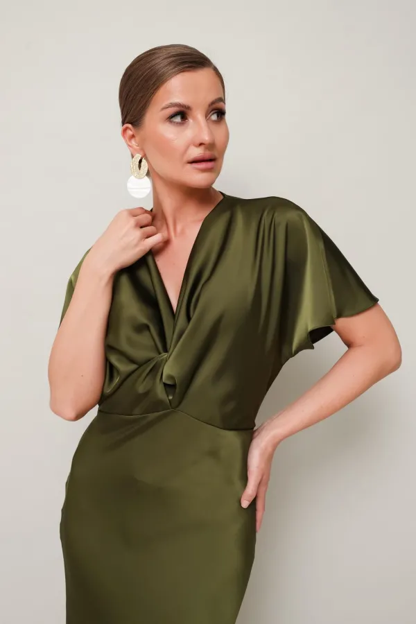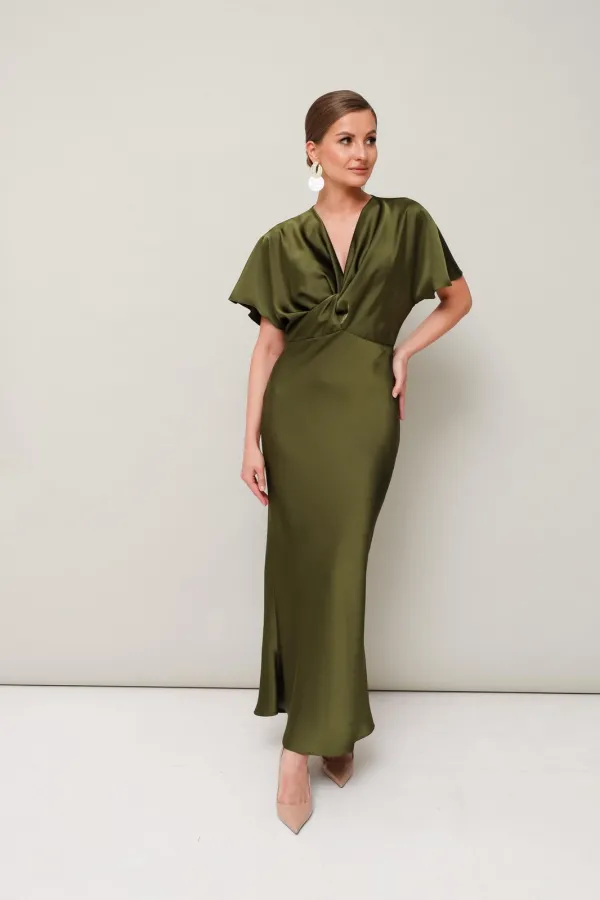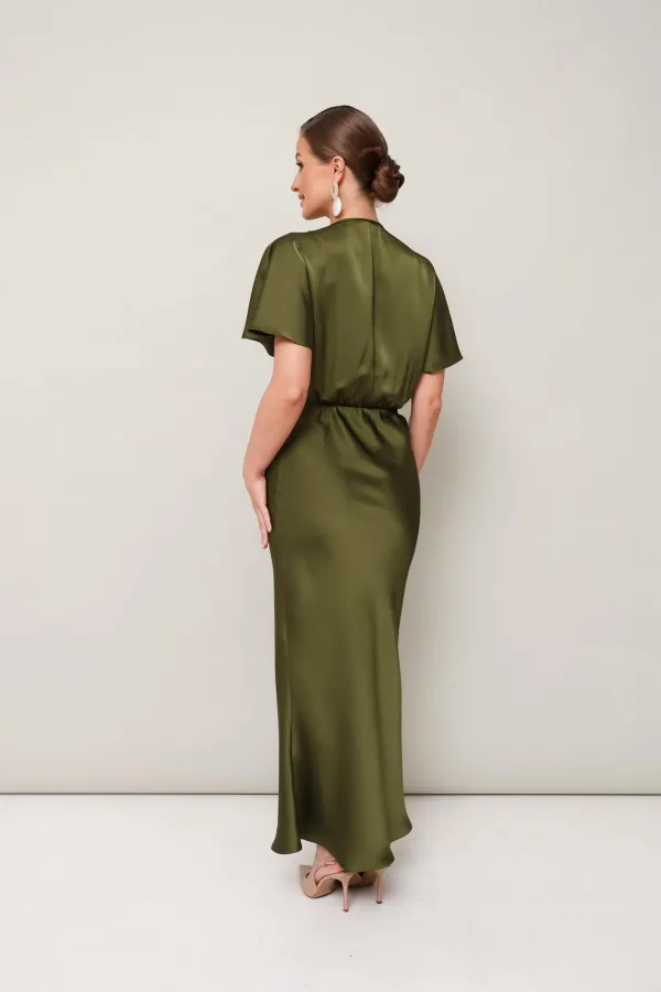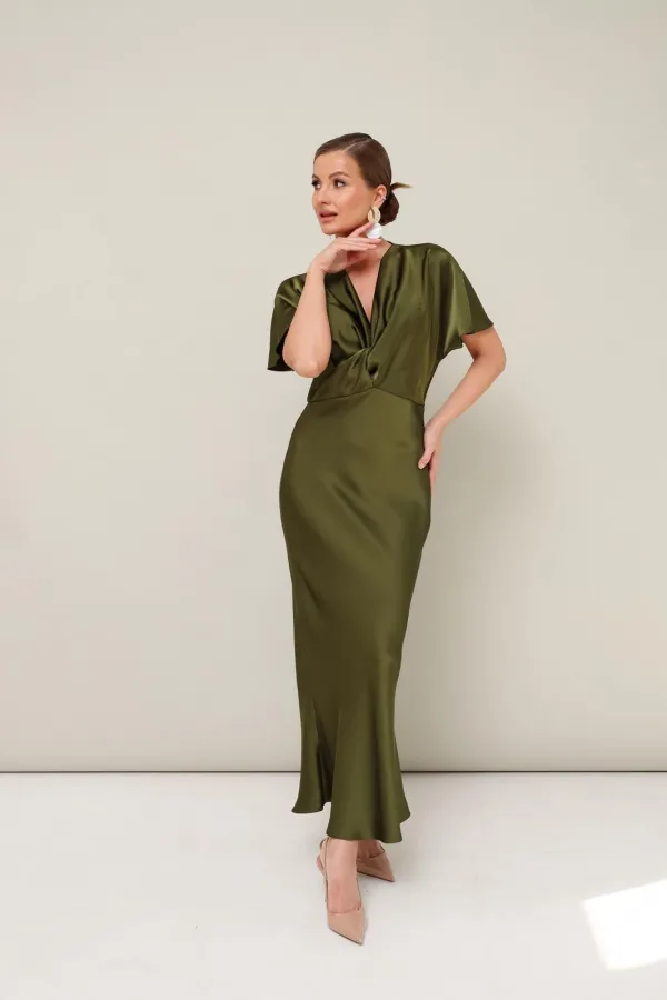 Платье полуприлегающего силуэта, отрезное по талии, выполнено из струящейся ткани с матовым блеском. V-образный вырез горловины. Спереди лифа обработан декоративный узел. Рукава короткие цельнокроеные. Спинка лифа со средним швом, по линии талии для комфорта обработана резинка. Крой юбки по косой.