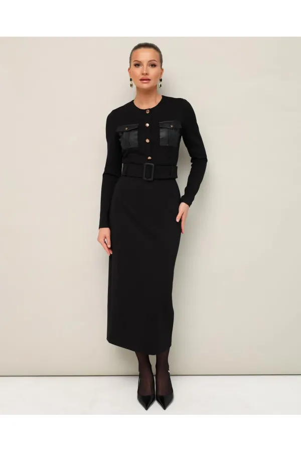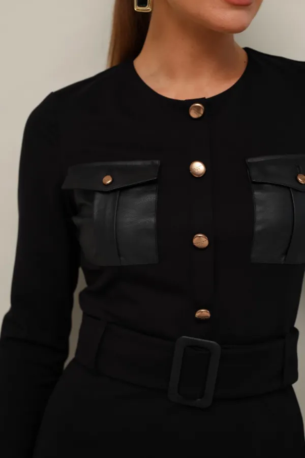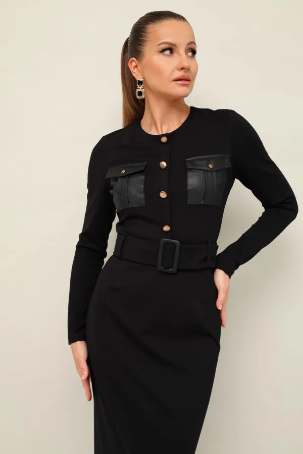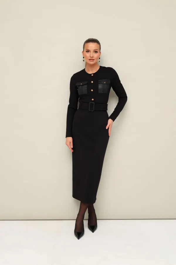 Платье прилегающего силуэта, отрезное по линии талии, выполнено из эластичного трикотажного полотна. Горловина округлой формы. По лифу обработана планка с пуговицами и нагрудные накладные карманы с клапанами. Длинные вта... Читать далее...