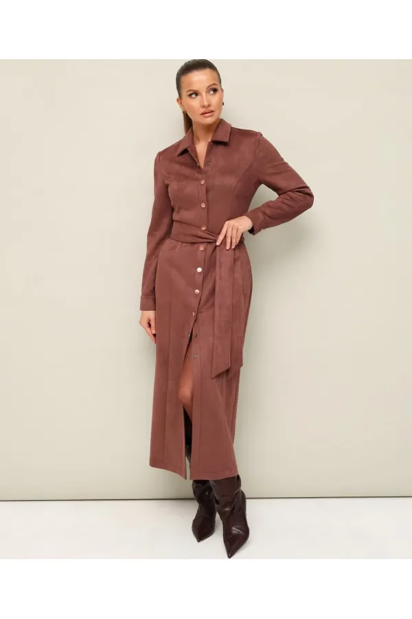 Силуэтное платье в длине миди, выполнено из экозамши. Отложной воротник с цельнокроеной стойкой. Центральная застёжка на кнопки. Перед с рельефными швами. Втачные двухшовные рукава с манжетами с застежкой на кнопки. Спинка со средним швом. В комплекте прилагается пояс из основной ткани.
