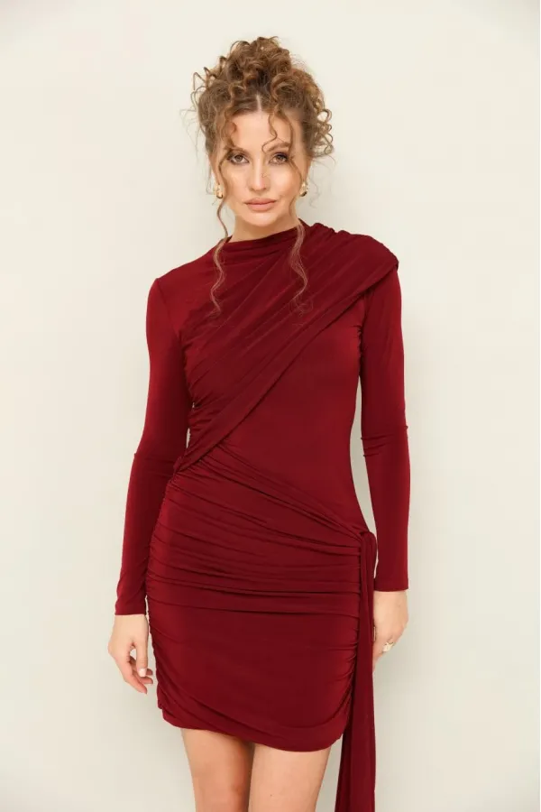 Платье прилегающего силуэта в длине мини, выполнено из эластичной ткани - масло. Горловина с цельнокроеной стойкой. Рукава длинные втачные. Перед и спинка декорированы диагональными деталями со сборкой в области лифа и бедер.