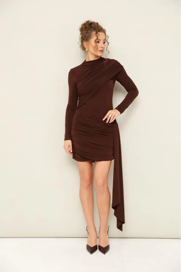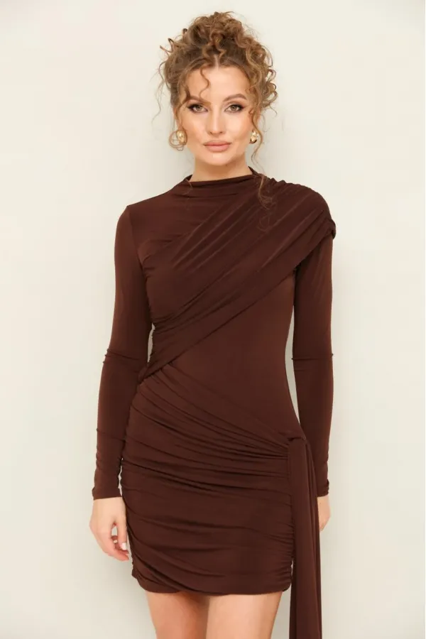 Платье прилегающего силуэта в длине мини, выполнено из эластичной ткани - масло. Горловина с цельнокроеной стойкой. Рукава длинные втачные. Перед и спинка декорированы диагональными деталями со сборкой в области лифа и бедер.