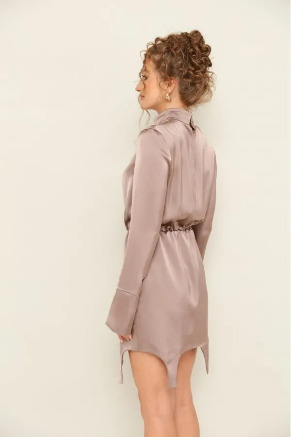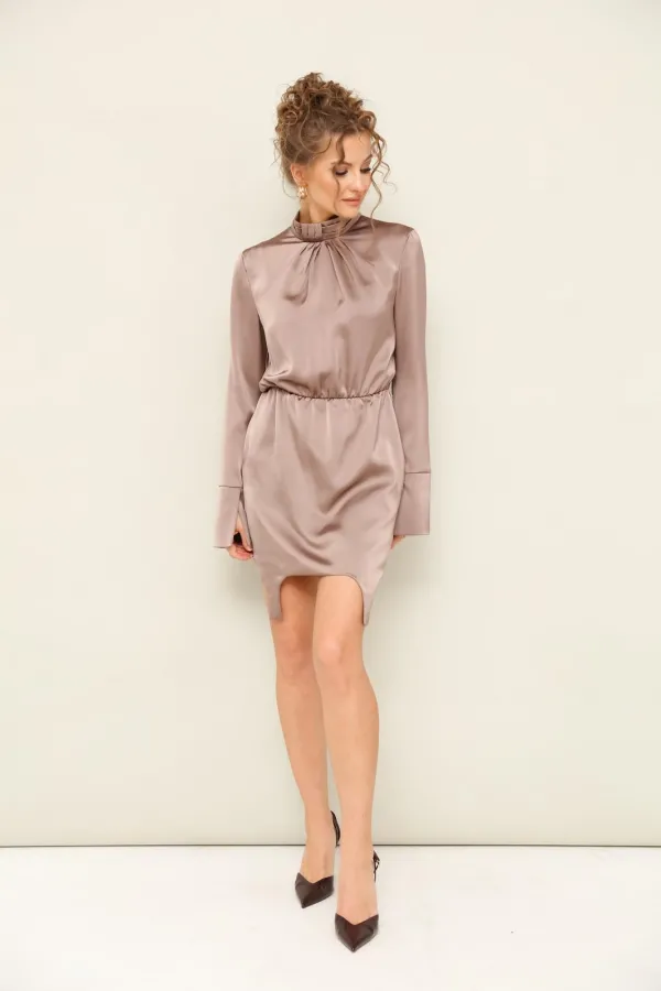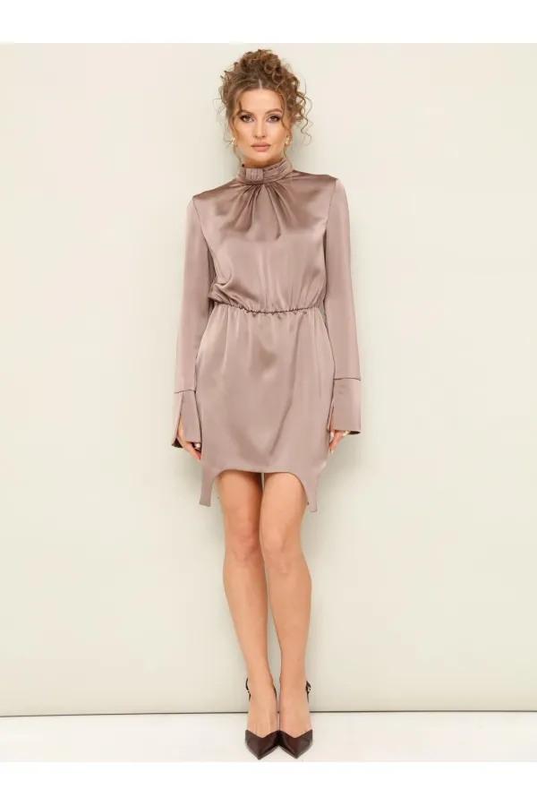 Стильное платье полуприлегающего силуэта, выполнено из струящейся ткани с матовым блеском. Платье отрезное по линии талии на резинке. Горловина с отрезной стойкой и лиф переда декорированы складками. Втачные длинные рукава с манжетами. В среднем шве спинки обработана застёжка на стойке на пуговицы и навесные петли. Низ платья фигурной формы.