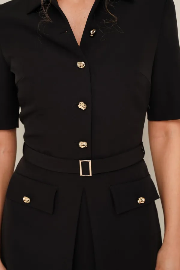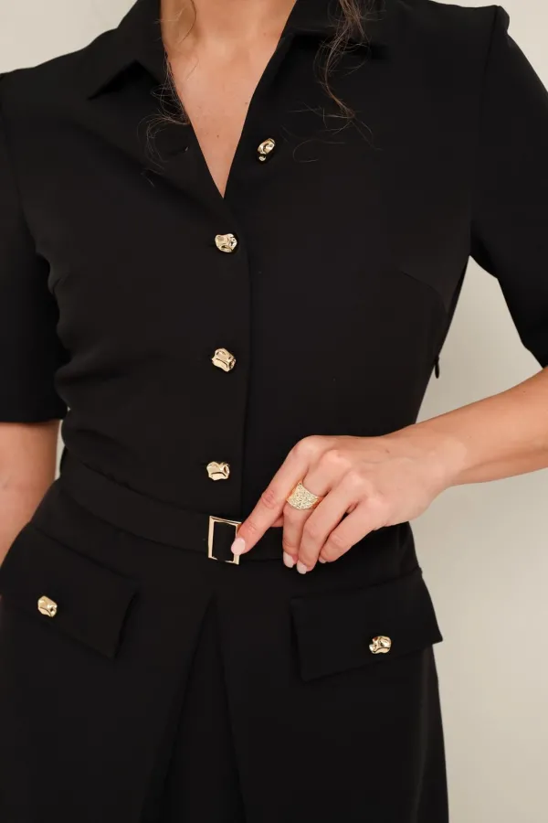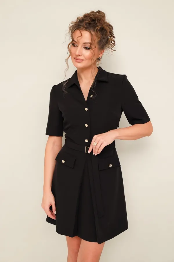 Платье отрезное по линии талии, выполнено из плательной ткани. Горловина с отложным воротником. Лиф с центральной застёжкой на петли и пуговицы. Втачные короткие рукава. Юбка А-образного силуэта, с центральной встречной складкой и с накладными клапанами с пуговицами. В комплекте съемный пояс с пряжкой. По талиии предусмотрены шлевки.