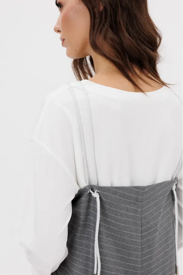 Сарафан упрямленного силуэта, на эффектных отделочных бретелях, фиксирующихихся на спинке декоративным узлом, с разрезом по боковому шву. Полочка с нагрудной, талиевыми вытачками, карманом с листочкой.