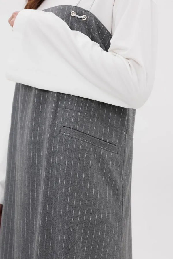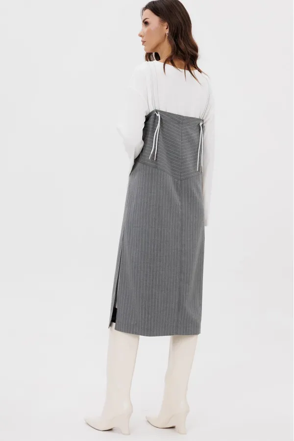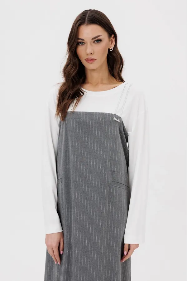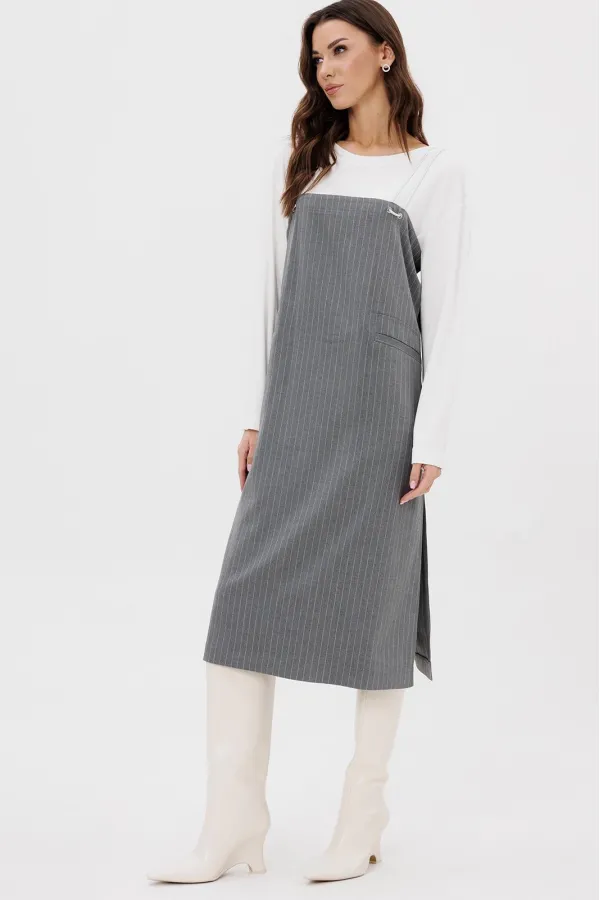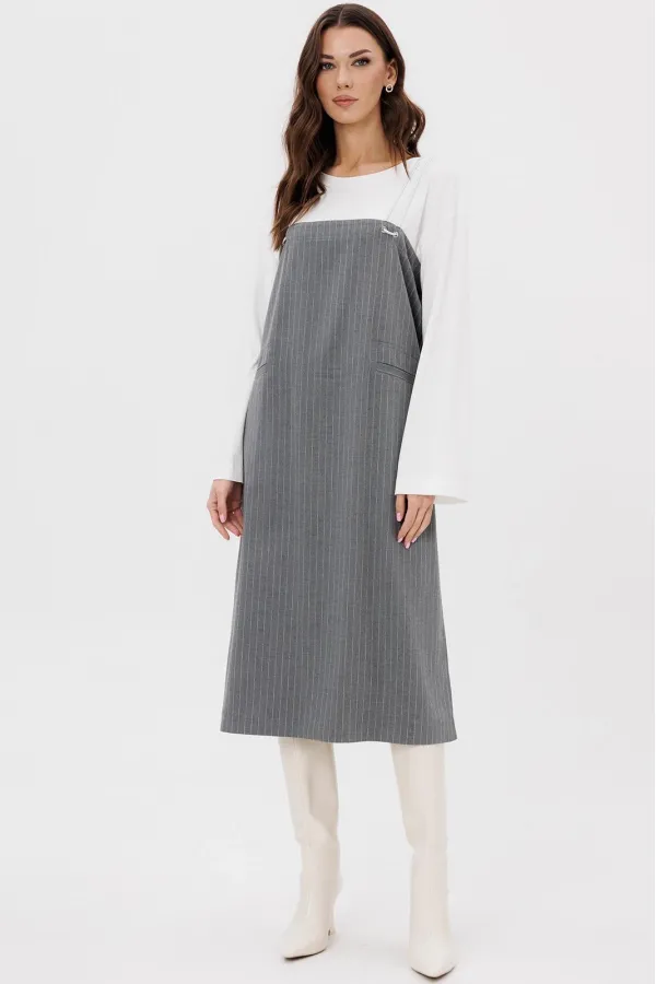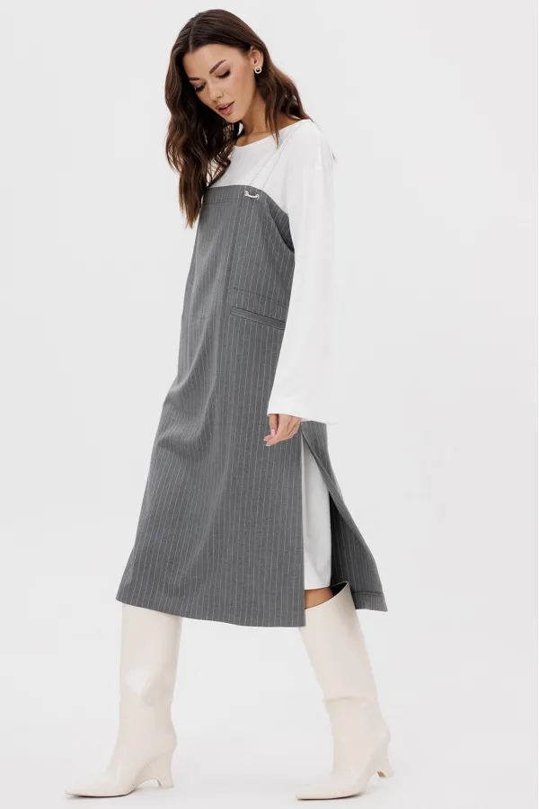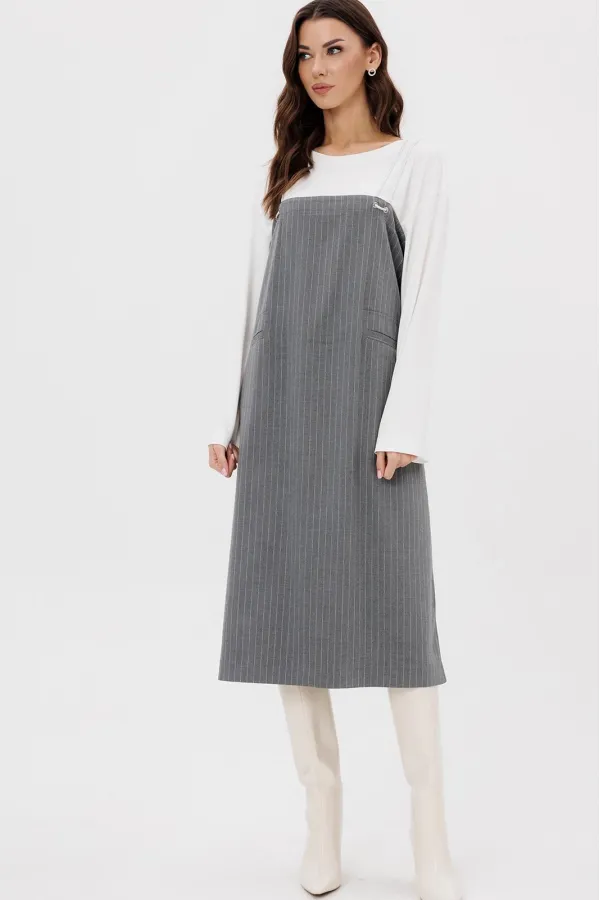 Сарафан длины миди-самая утилитарная вещь осеннего сезона. С ним можно собрать десяток комплектов из базовой одежды, а еще красиво пережить холодный сезон. Восхитительный комплект, в котором первый слой-платье. Оно может быть и самостоятельным вариантом образа, и конечно же идеально под сарафан.