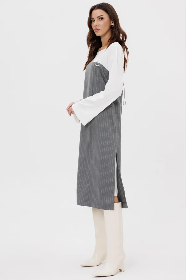 Полуприлегающий силуэт платья, втачной покрой, длинный рукав, разрез в боковом шве.