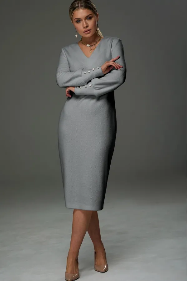 Платье женское, трикотажное полуприлегающего силуэта. V образным вырезом по переду. Спинка со средним швом заканчивающимся разрезом. Рукава прямые, собирающиеся снизу на манжет. Платье длиной ниже линии колена.