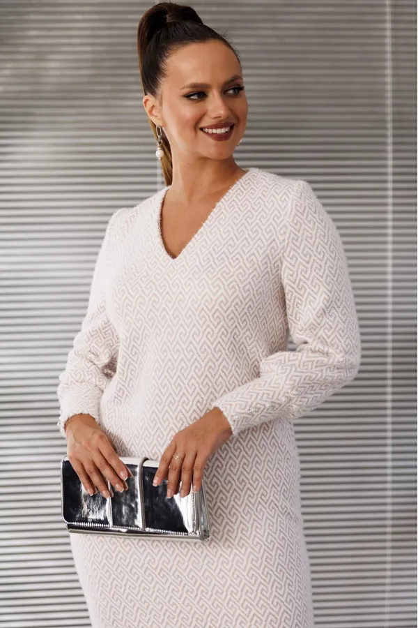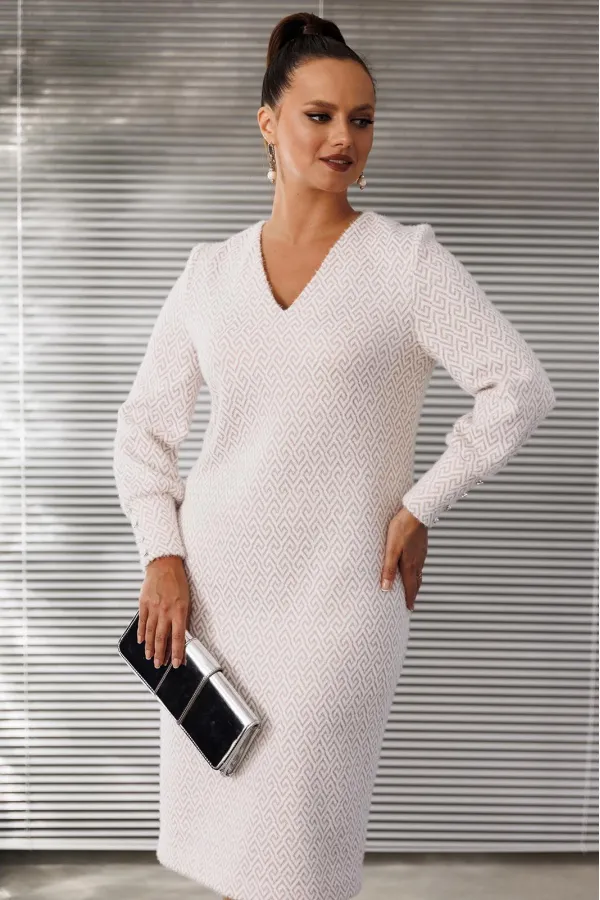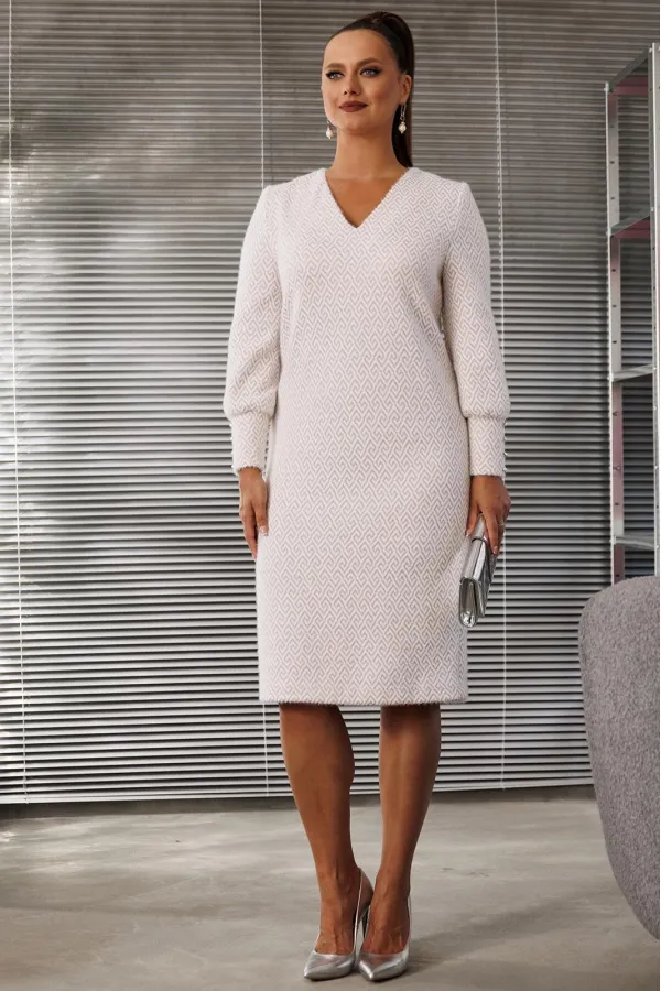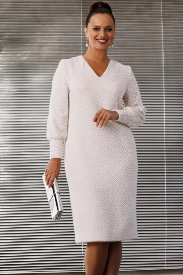 Платье женское, трикотажное полуприлегающего силуэта. v-образным вырезом по переду.Со средним швом заканчивающиеся разрезом.Рукава прямые собирающиеся с низу на манжет. Платье длиной ниже линии колена. На манжетах нашиты 4 декоративные пуговицы.