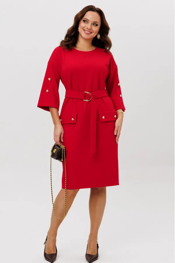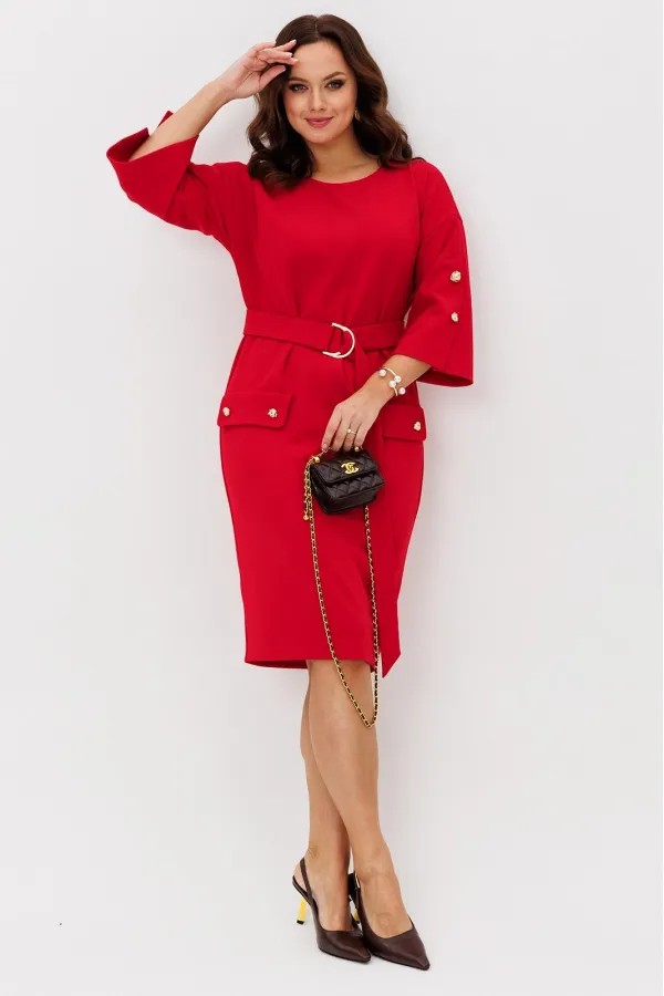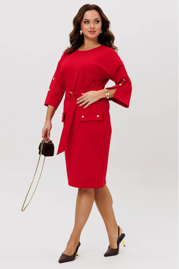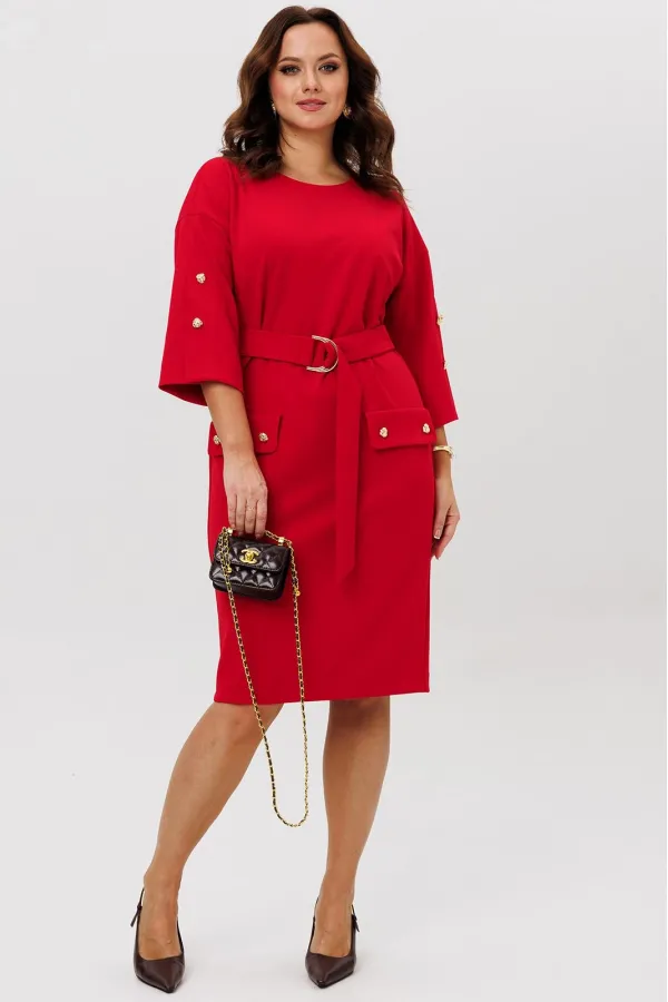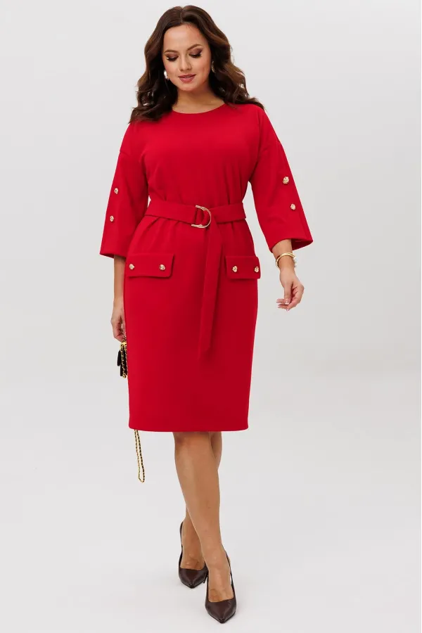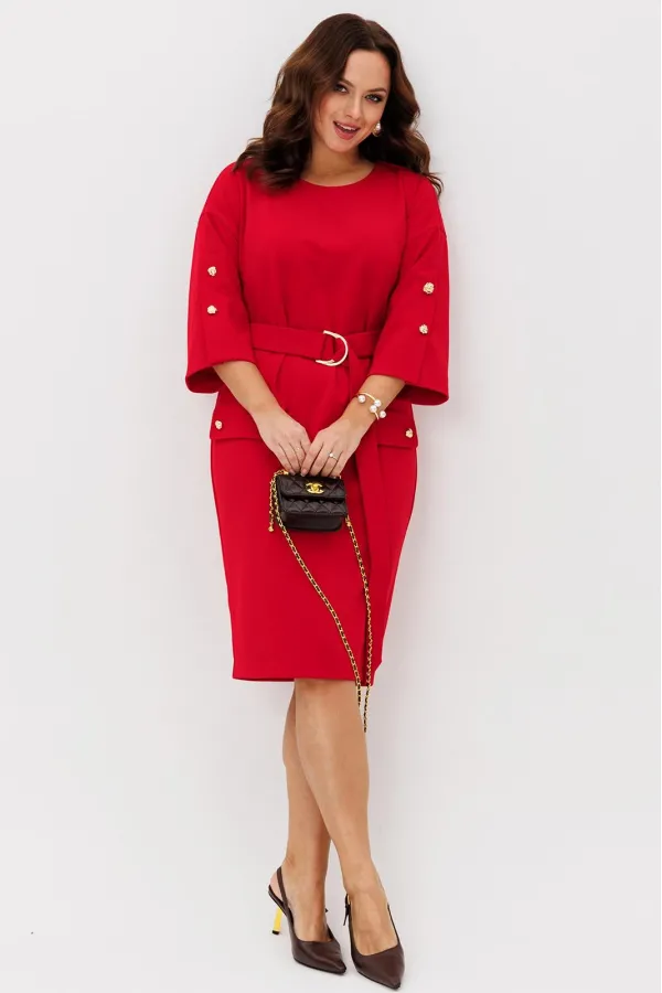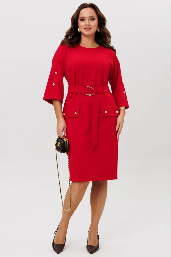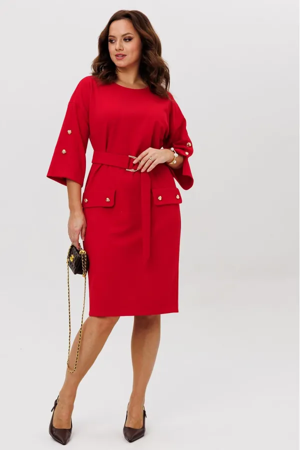 Нарядное платье из трикотажного крепа с мелким блеском станет прекрасным выбором для вечерних мероприятий, корпоративных встреч и праздничных торжеств. Особенностью этого стильного платья является его прямая модель ,которая подчеркивает женственность и элегантность. Платье подходит для полных женщин. Платье прямого силуэта с нагрудными вытачками. Рукав спущенный с декоративной шлицей и пуговицами. Декором платья являются клапаны и пуговицы. Пояс эффектно подчеркивает талию.