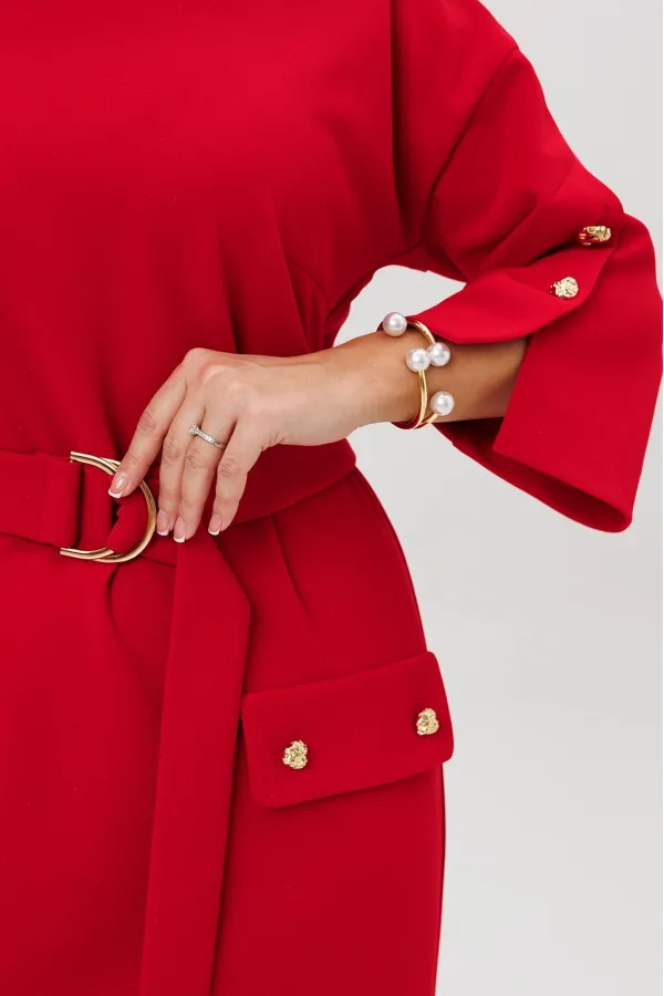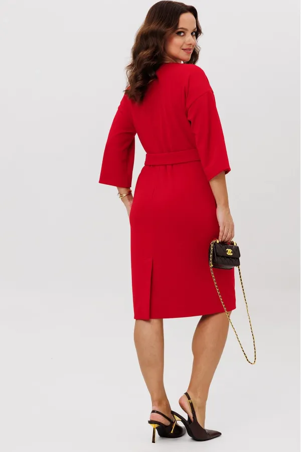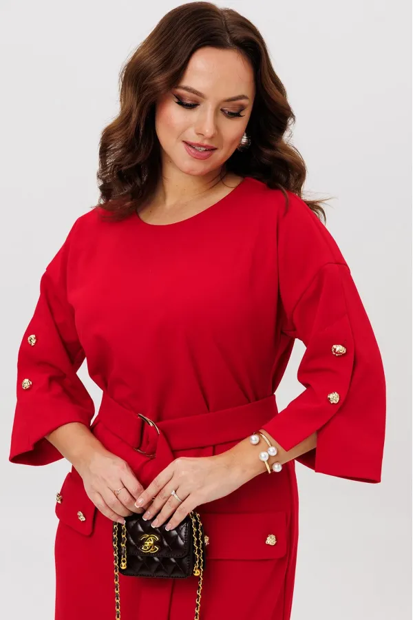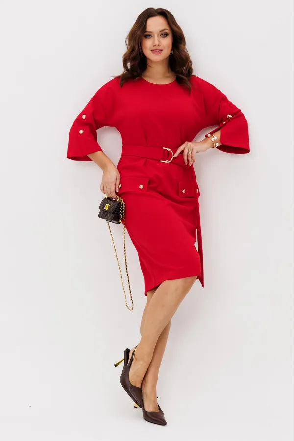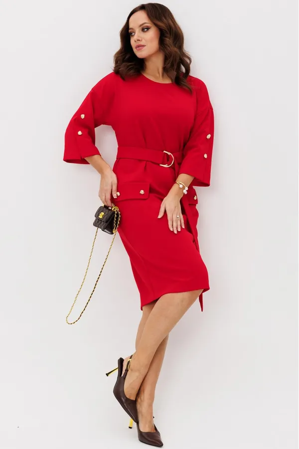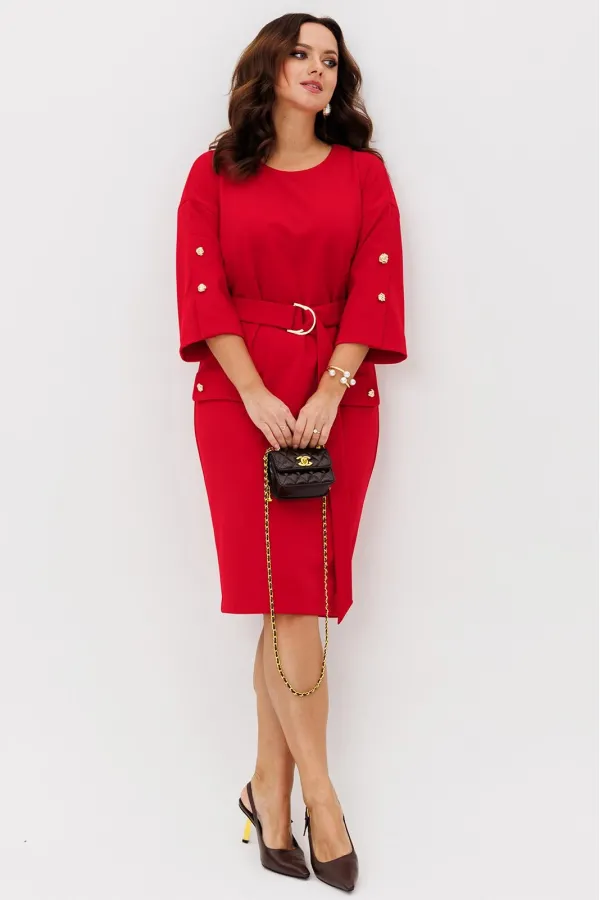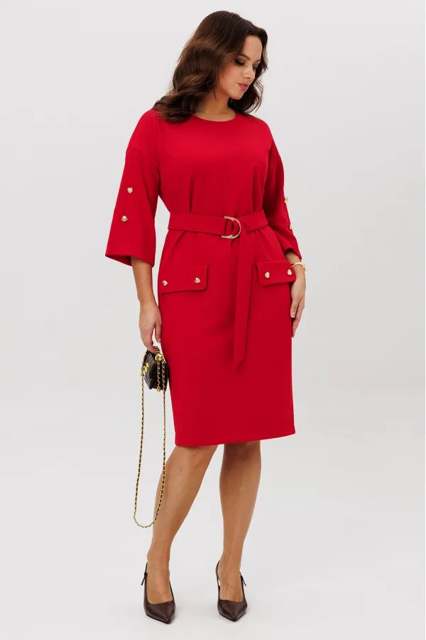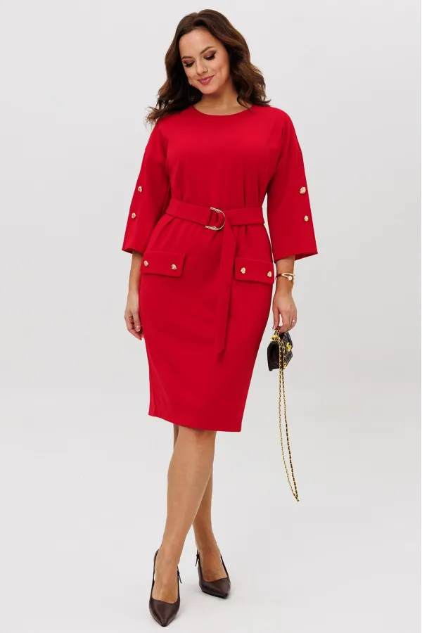 Нарядное платье из трикотажного крепа с мелким блеском станет прекрасным выбором для вечерних мероприятий, корпоративных встреч и праздничных торжеств. Особенностью этого стильного платья является его прямая модель ,которая подчеркивает женственность и элегантность. Платье подходит для полных женщин. Платье прямого силуэта с нагрудными вытачками. Рукав спущенный с декоративной шлицей и пуговицами. Декором платья являются клапаны и пуговицы. Пояс эффектно подчеркивает талию.