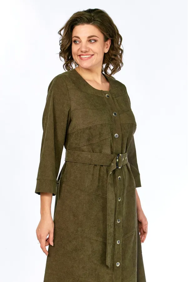 Платье женское А-силуэта из штруксовой ткани в длине миди. Перед с округлым вырезом и центральной застежкой на петли-пуговицы. В боковых швах функциональные карманы. Спинка с кокеткой и средним швом. Перед и спинка платья оформлены косыми подрезами по всей длине изделия. Рукав одношовный втачной, снизу на притачной манжете. Платье дополняет съемный пояс с декоративной пряжкой.