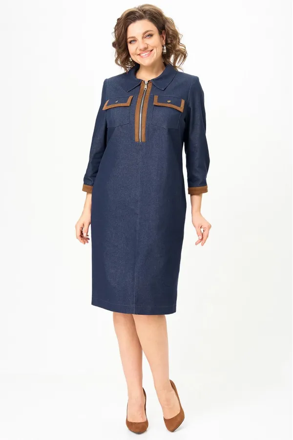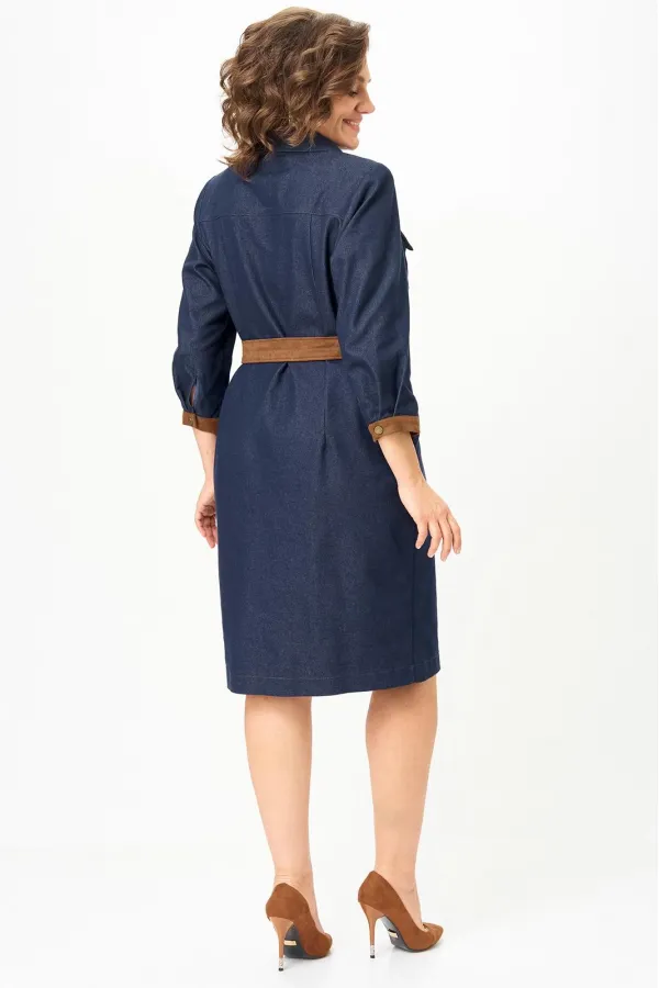 Платье женское выполнено из джинсовой ткани, полуприлегающего силуэта, длиной ниже колена, заужено к низу. По переду и спинке расположена горизонтальная кокетка. По спинке расположены талиевые выточки, моделирующие силуэт. По переду в шов притачивания кокетки вставлены клапана, по груди – выточки и накладные карманы. Воротник рубашечного типа. В верхней части переда расположена центральная застежка – молния. Рукав втачной одношовный, длиной ¾, с притачной манжетой. Платье дополнено съемным поясом.