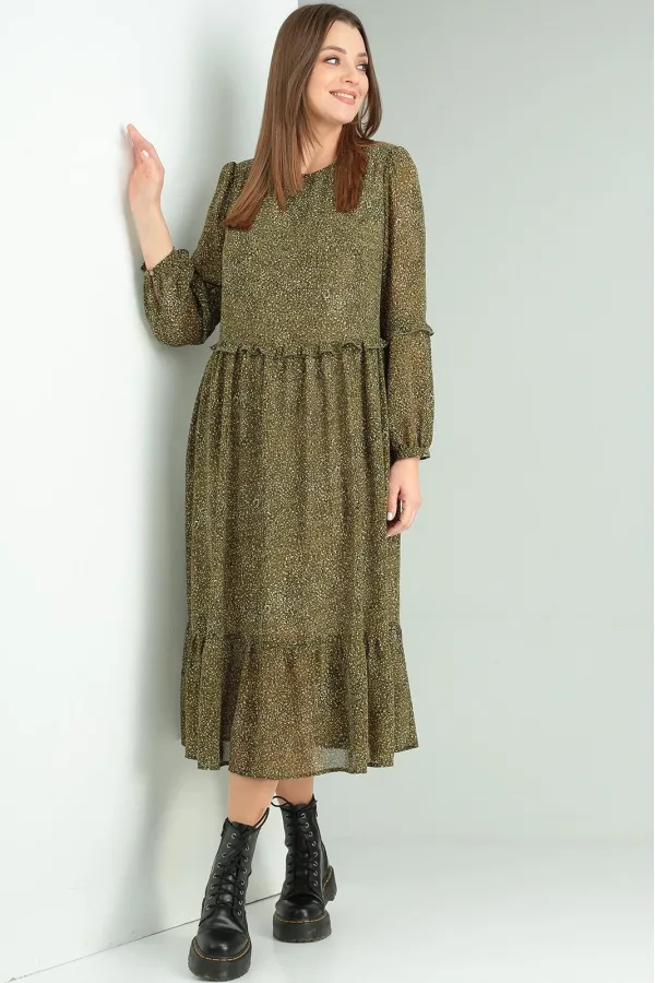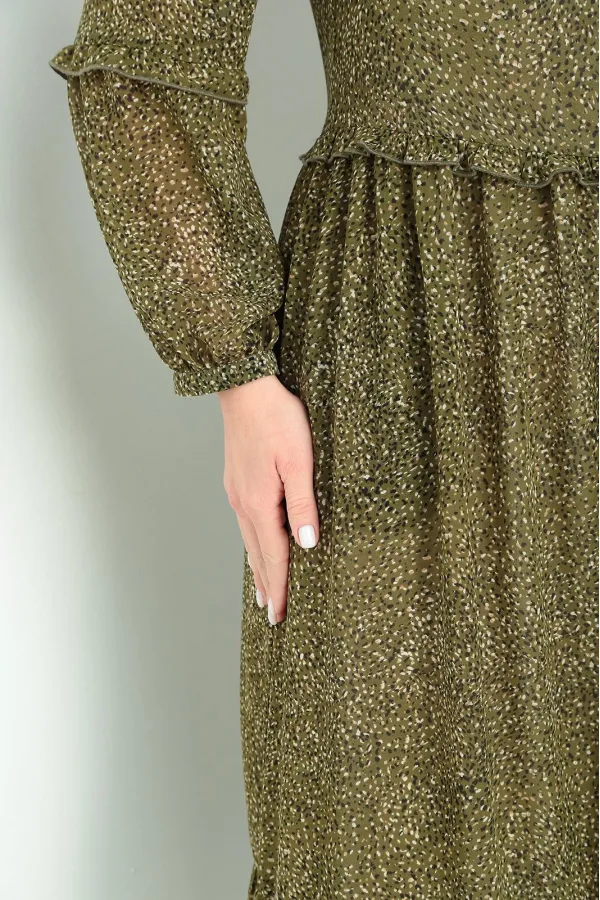 Рукав: длинный. Длина рукава: 61 см. Длина изделия: 118 см. Описание: Платье женское из шифона на подкладке. Лиф переда с округлой горловиной, с нагрудными выточками. Спинка со средним швом и застежкой на пуговицу с петелькой. Рукав одношовный, втачной, украшен рюшей на сборке, застегивающийся на манжету. Юбка платья состоит из двух частей , нижняя часть- присборенный волан. Линия талии выделена рюшей. В боковых швах юбки имеются карманы