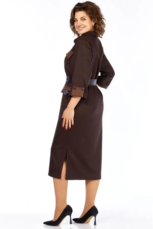 Современное платье прямого силуэта в стиле сафари. Отличный выбор для Вас в любое время года! По переду платья расположены два накладных нагрудных кармана с клапанами и один - по боковому переда. Центр платья на планке, застегивающейся на петли-пуговицы до низа. Спинка с кокеткой и средним швом. Боковой шов платья с разрезами внизу. Горловина с рубашечным воротником на притачной стойке. Рукав одношовный длиной 7/8 с декоративной планкой. Платье дополняет съемный пояс, подчеркивающий талию.