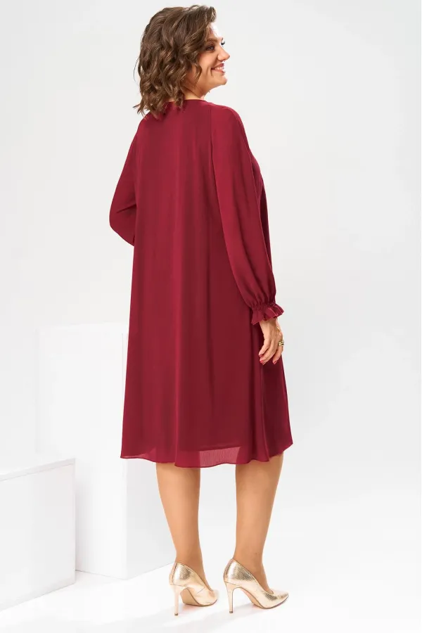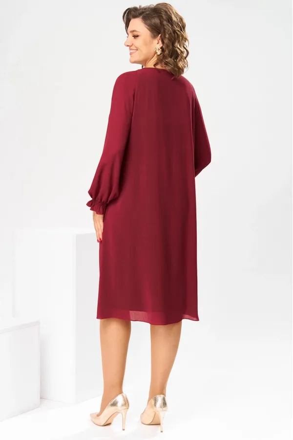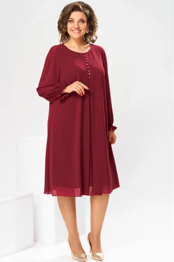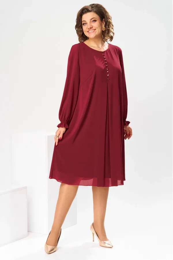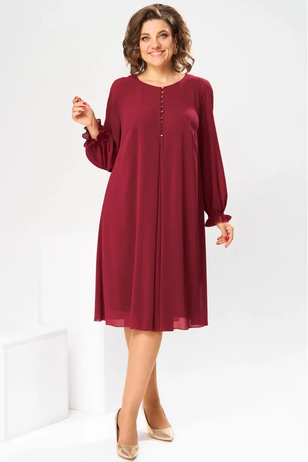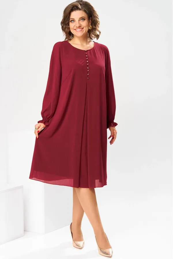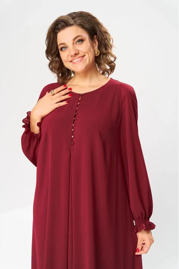 Платье женское расширенное к низу, длиной за колено. Перед с двумя нагрудными вытачками, с разрезом по центру, фиксирующимся на 10 навесных петель и 10 пришивных пуговиц с одной бантовой складкой, выходящей из-под разреза. Спинка цельнокроеная. Горловина круглая, обтачная, без воротника. Рукав полуреглан, втачной, длинный, одношовный, низ рукава собран на эластичную тесьму. Платье на подкладке. Длина спинки 107 см. Длина рукава от горловины 67 см