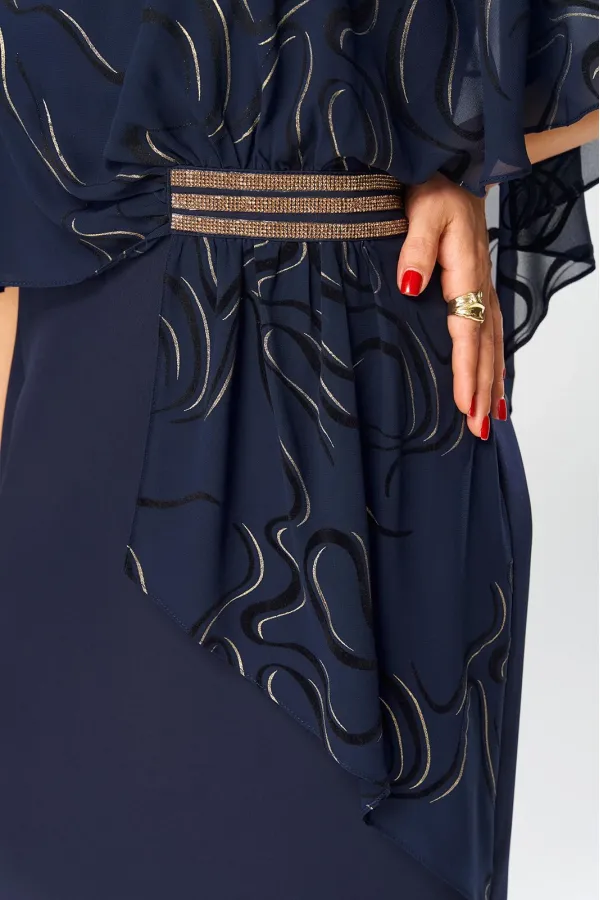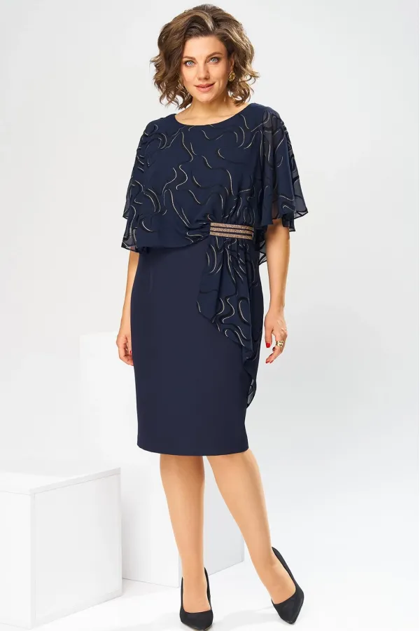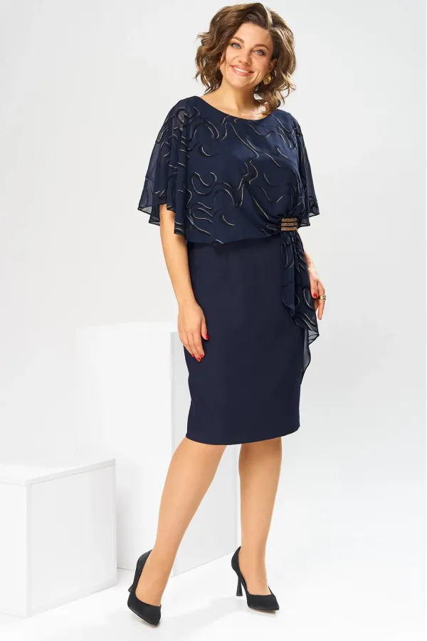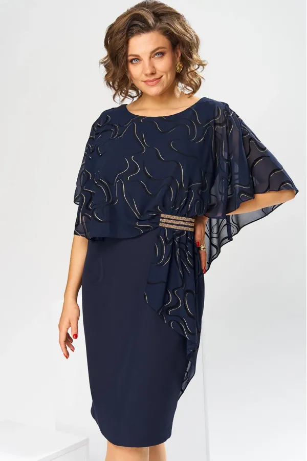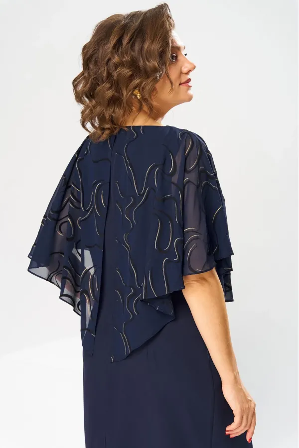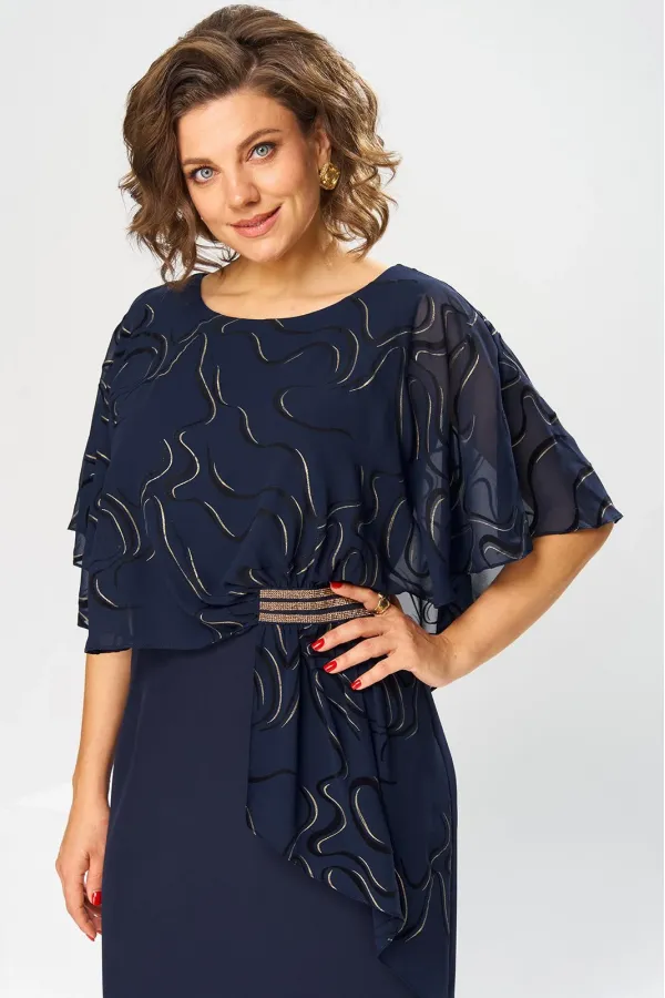 Платье женское относится к нарядной торжественной одежде. Платье полуприлегающего силуэта, с отлетной накидкой длиной за колено. Перед с двумя нагрудными вытачками, с двумя талиевыми вытачками. Спинка с двумя талиевыми вытачками и средним швом, заканчивающимся шлицей. Застежка на потайную тесьму-молнию в среднем шве спинки. Горловина круглая, обтачная, без воротника, по горловине закреплена накидка. Слева на уровне линии талии отделочным хлястиком, декорированным тесьмой накидка закрепляется на платье, нижняя часть накидки закреплена в левом боковом шве. Накидка с фигурным низом. Платье без рукавов. Длина спинки 103 см. Длина накидки от горловины 38 см