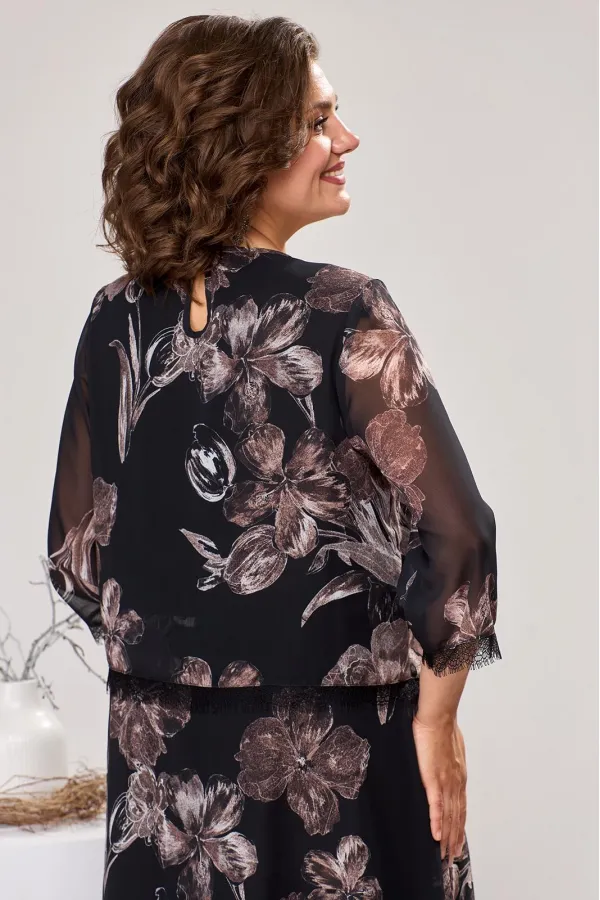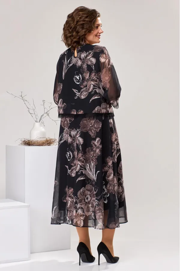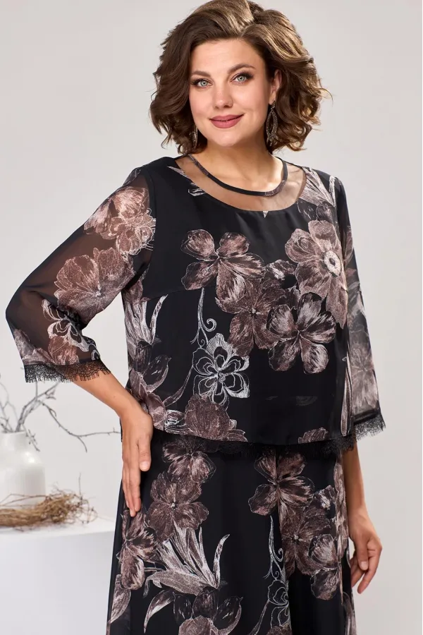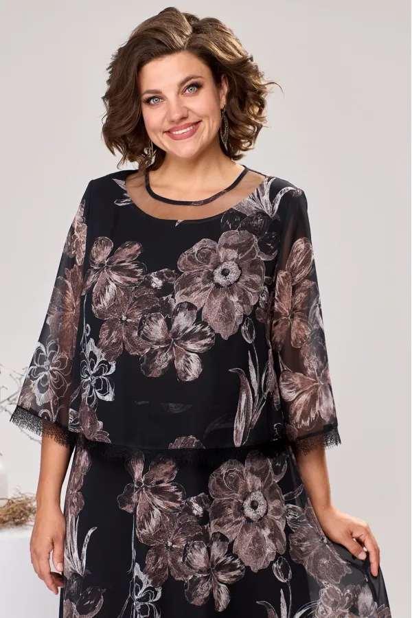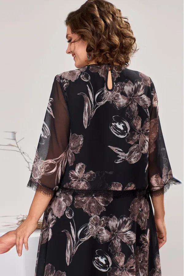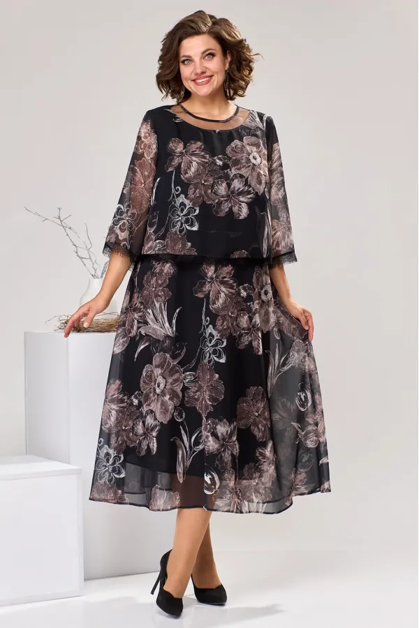 Платье женское, отрезное по линии талии, расширенное к низу, длиной до середины икры. Верхняя часть переда с 2-мя нагрудными выточками, отлётная, низ декорирован настрочным кружевом. Нижняя часть переда цельнокроеная. Верхняя часть спинки отлётная, низ декорирован надстрочным кружевом, нижняя - цельнокроеная. Горловина круглая, с втачной планкой из отделочной ткани по переду. Горловина с разрезом капелькой на спинке. Горловина и разрез обработаны косой бейкой, разрез фиксируется на 1-ну навесную петлю и 1-ну пришивную пуговицу. Рукав втачной, одно шовный, длиной 3/4 с притачным кружевом по низу. Платье на подкладке. Платье с плечевыми накладками.