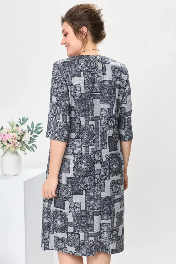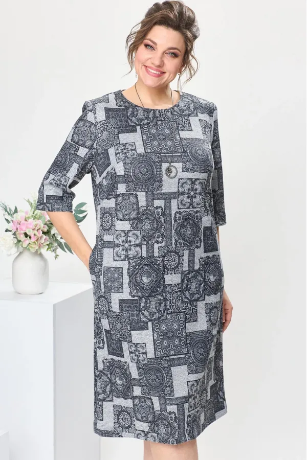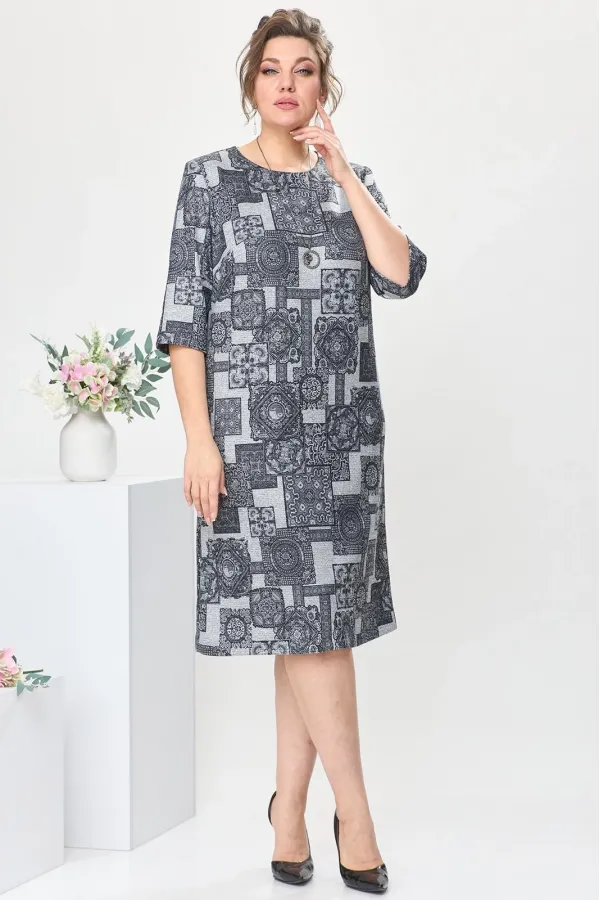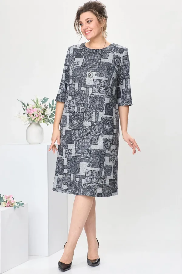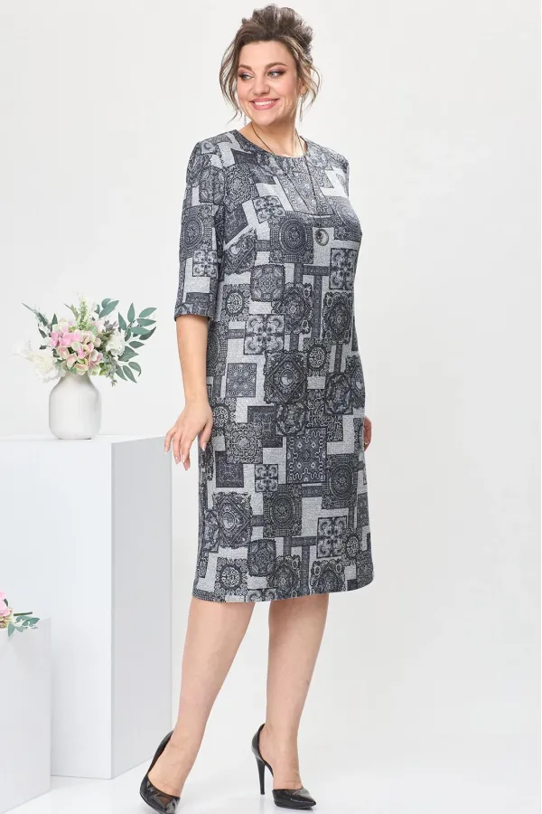 Платье женское предназначено для повседневной носки. Платье женское прямого силуэта, длиной за колено. Перед с двумя нагрудными вытачками. Спинка со средним швом, с двумя втачными планками вверху среднего шва. Застежка на три пробивных металлических кнопки на планках спинки. Горловина круглая, обтачная, без воротника. Рукав втачной, одношовный, длиной за локоть. В боковых швах платья обработаны карманы. Платье с плечевыми накладками. К платью прилагается съемное украшение. Длина платья 105 см. Длина рукава 40 см.ВНИМАНИЕ! Украшение входит в комплект с платьем!