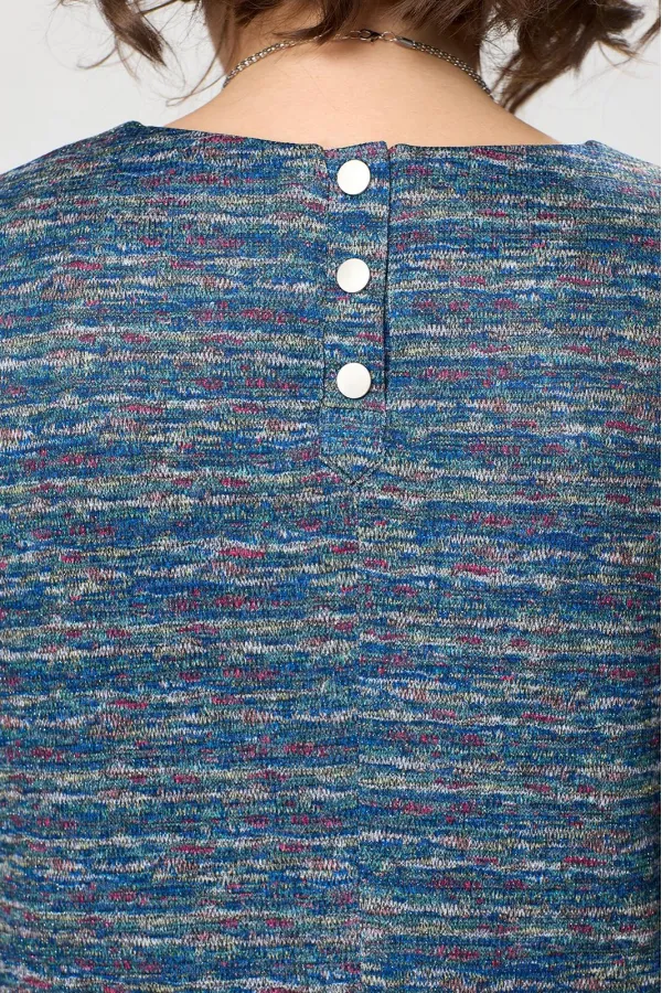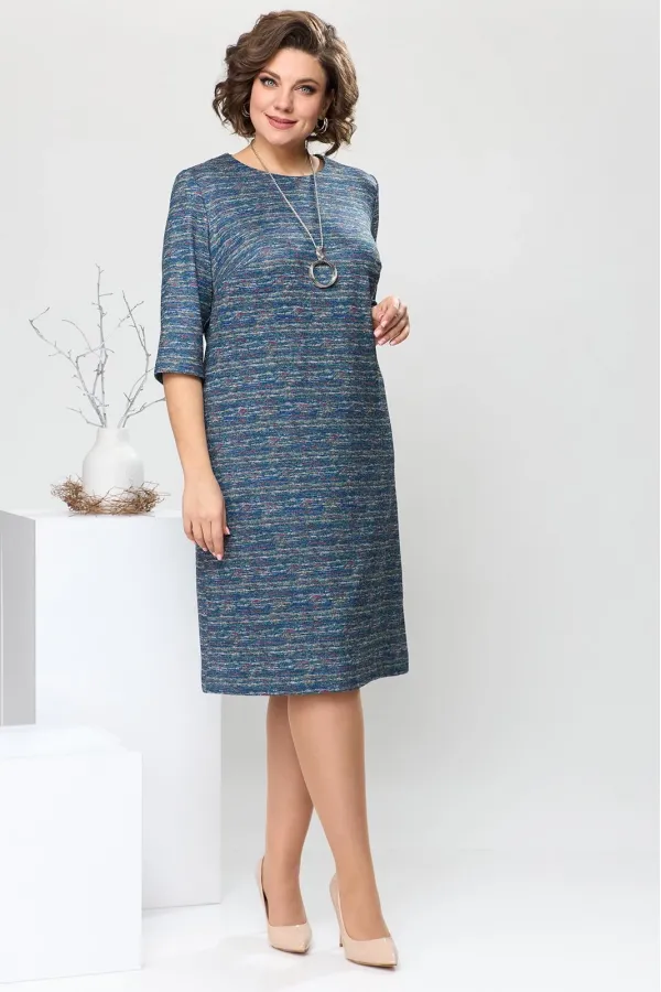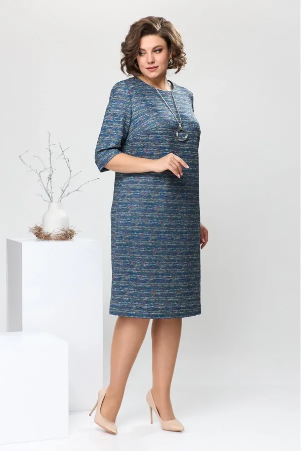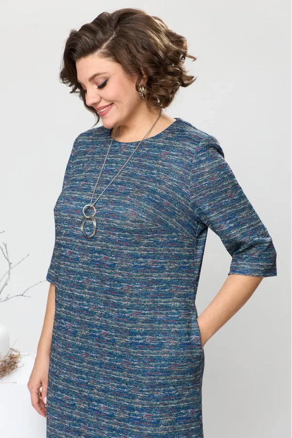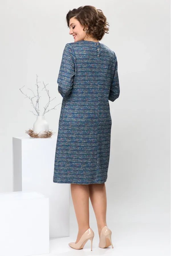 Платье женское предназначено для повседневной носки. Платье женское прямого силуэта, длиной за колено. Перед с двумя нагрудными вытачками. Спинка со средним швом, с двумя втачными планками вверху среднего шва. Застежка на три пробивных металлических кнопки на планках спинки. Горловина круглая, обтачная, без воротника. Рукав втачной, одношовный, длиной за локоть. В боковых швах платья обработаны карманы. Платье с плечевыми накладками. К платью прилагается съемное украшение. Длина платья 105 см. Длина рукава 40 см.ВНИМАНИЕ! Украшение Не входит в комплект с платьем!