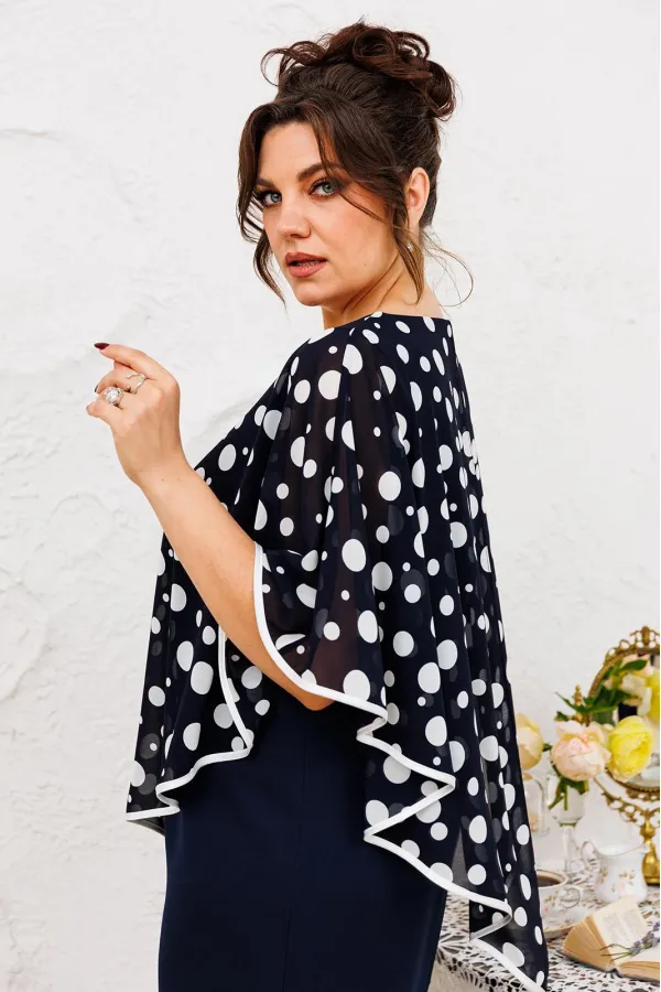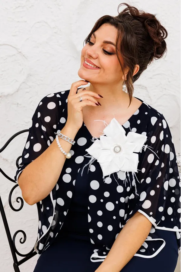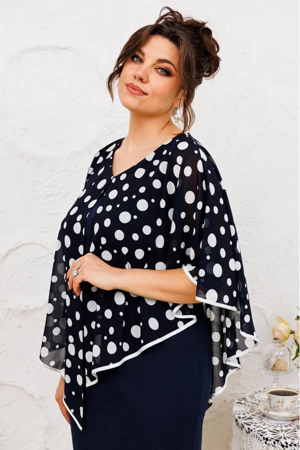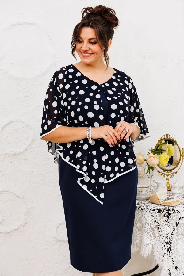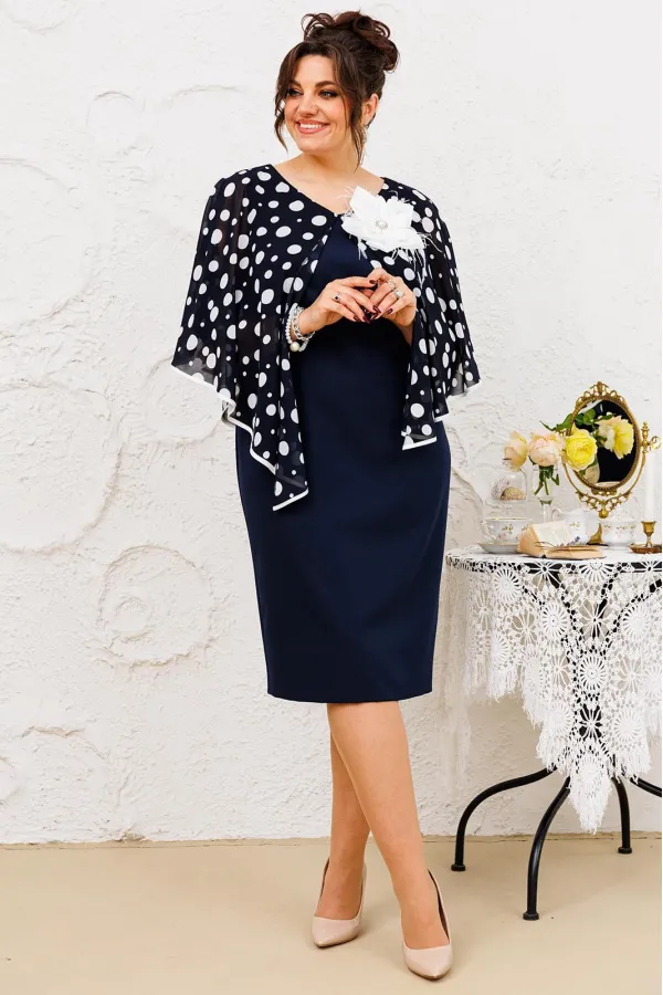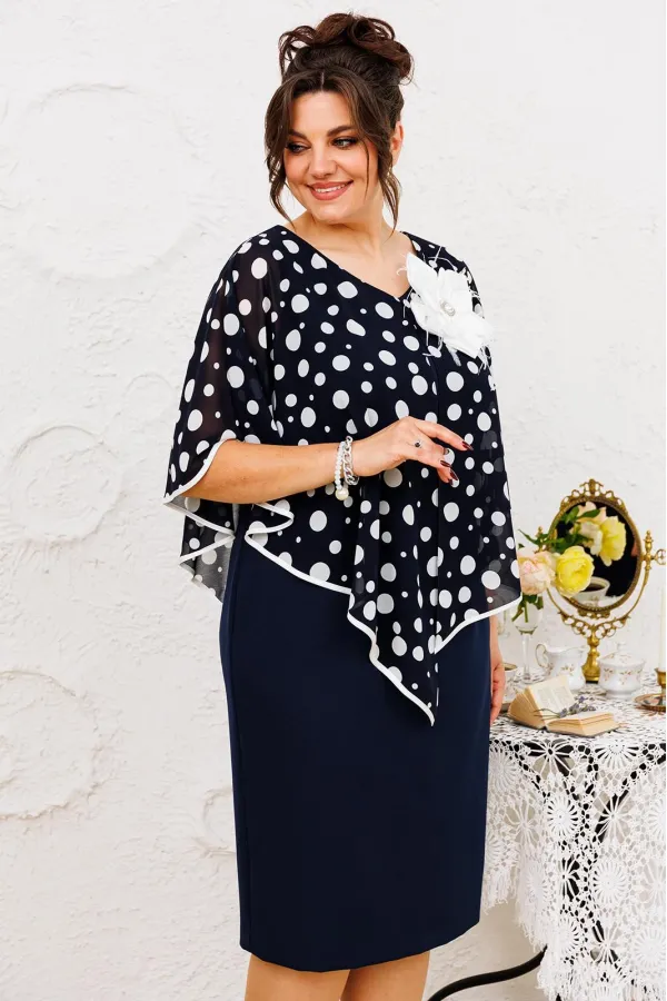 Платье женское относится к нарядной торжественной одежде. Платье женское полу прилегающего силуэта, длиной за колено. Платье с отлётной накладкой. Перед с 2-мя нагрудными вытачками и 2-мя таллиевыми вытачками. Спинка с 2-мя таллиевыми вытачками и средним швом, заканчивающимся шлицей. Горловина круглая обтачная без воротника, по горловине закреплено накладка с фигурным низом, обработанным косой бейкой из отделочной ткани. Застёжка на потайную тесьму-молнию в левом боковом шве платья. Платье без рукавов. Проймы обтачке, по краю пройм отделочная строчка 0,6 см. Перед платья декорируются съёмным украшением. Платье без плечевых накладок. Длина спинки 105 см.