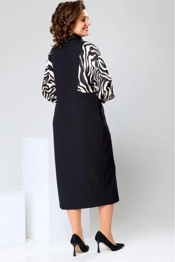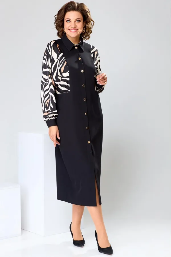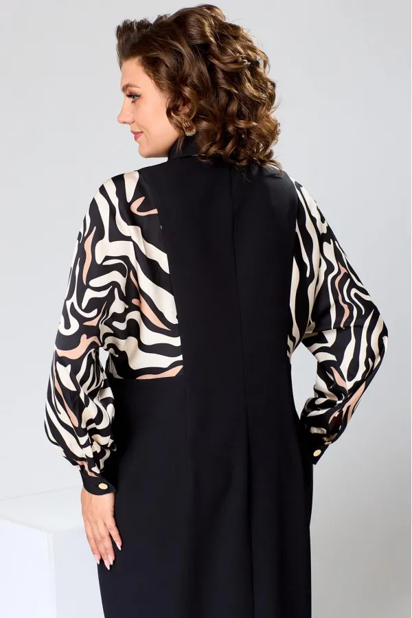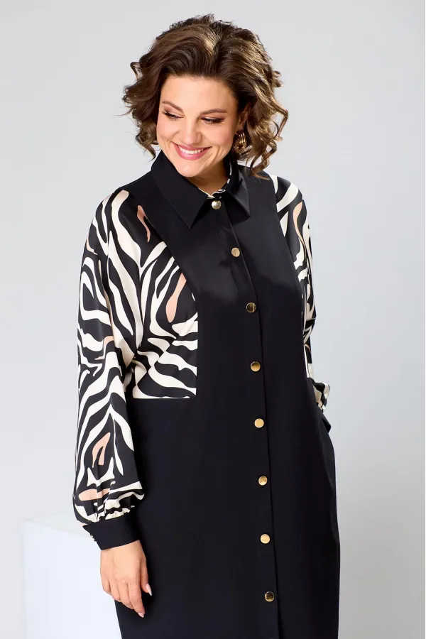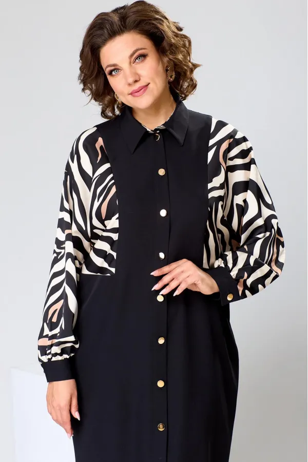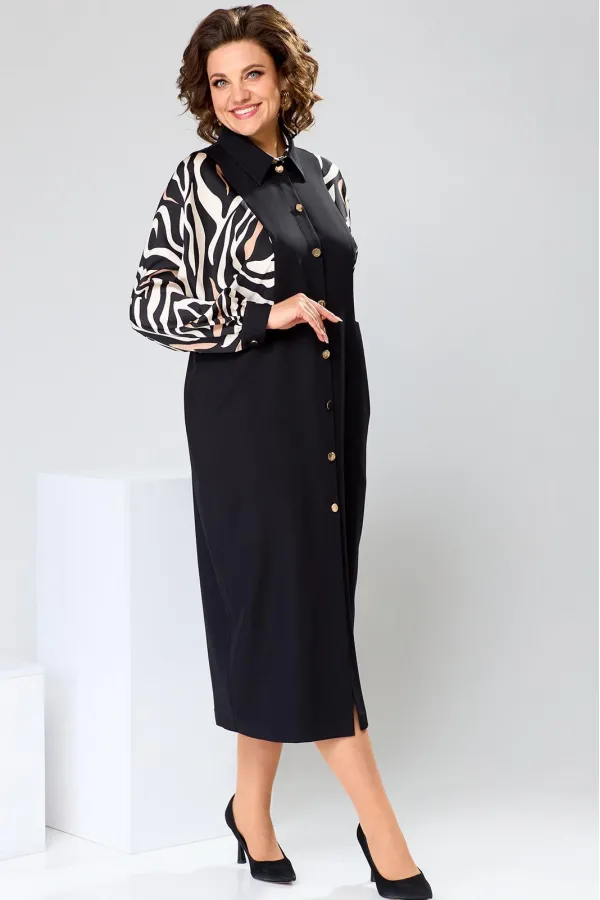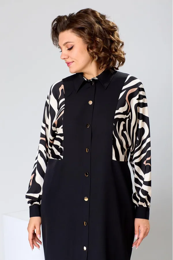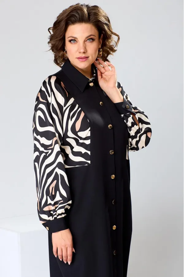 Платье женское прямого силуэта, предназначено для повседневной носки. Платье женское, прямого силуэта, длиной до середины икры. Перед с 2-мя отрезными бочками, с 2-мя вертикальными цельнокроеными планками. Спинка со средним швом, с 2-мя отрезными бочками, с 2-мя таллиевыми вытачками. Рукав длинный одно шовный, цельнокроеный с бочком переда и бочком спинки, рукав из отделочной ткани, внизу со сборкой и притачной манжетой с застёжкой на петлю обмётанную 1-ну и 1-ну пришивную пуговицу. Боковые швы с карманами. Горловина круглая с втачным воротником рубашечного типа с отрезной стойкой из отделочной ткани. Застёжка центральная на 8-мь вертикально обмётанных петель и 8-мь пришивных пуговиц. Платье без плечевых накладок. Длина спинки платья 121 см, длина рукава 65 см, дли на рукава о горловины 73 см.