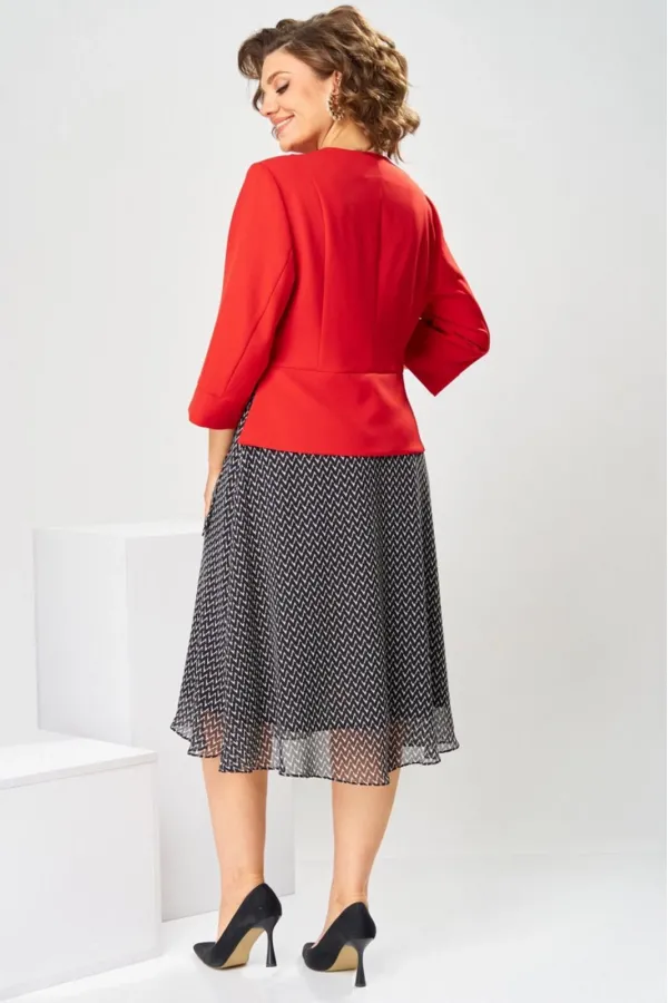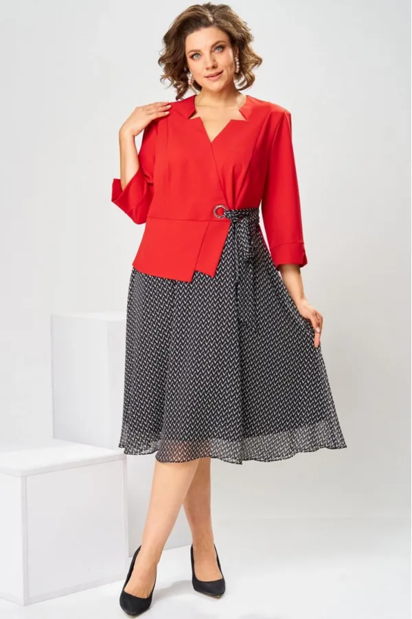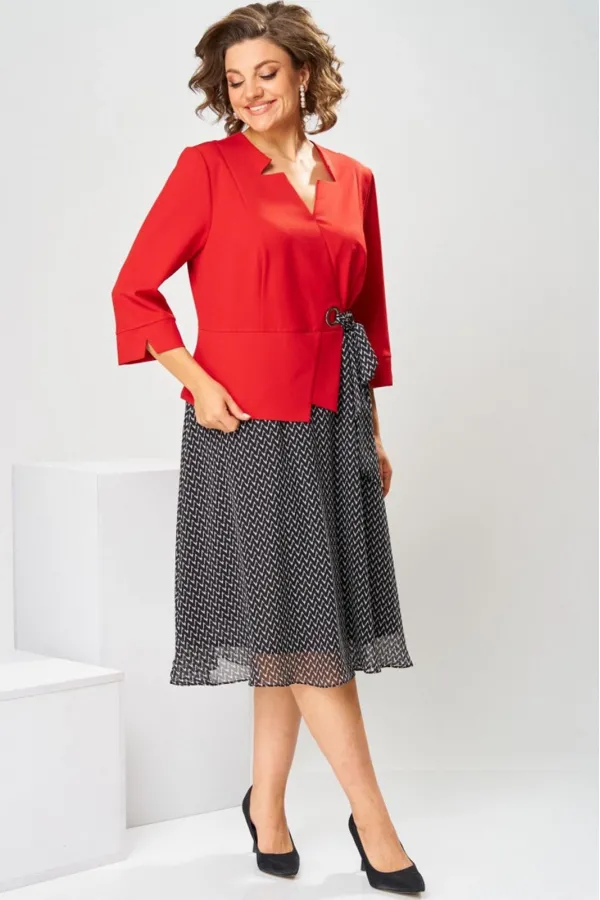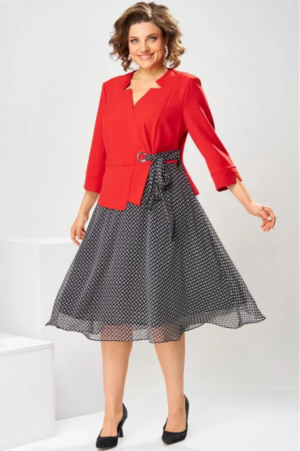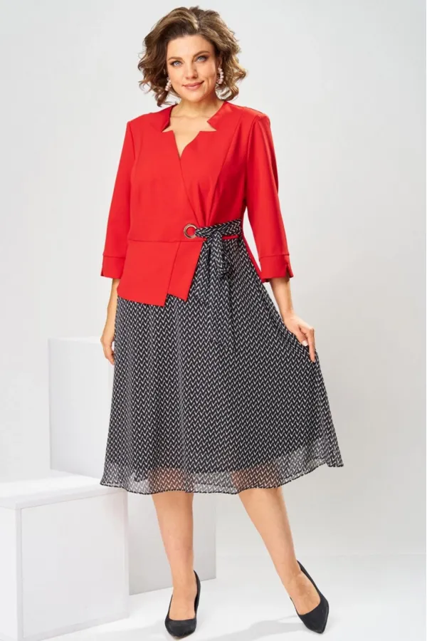 Платье женское относится к нарядной торжественной одежде, но может использовано и при повседневной носке. Платье женское, отрезное по линии талии, расширенное к низу, длиной за колено. Верхняя часть переда с отрезными рельефами, выходящими из плечевых швов, центральная часть с зафиксированным запахом. Верхняя часть спинки со средним швом и 2-мя рельефами, выходящими из плечевых швов. Горловина с V-образным вырезом, фигурная, обточная без воротника. Нижняя часть переда и нижняя часть спинки цельнокроеные, выполнены из отделочной ткани. Шов соединения верхней и нижней частей платья декорирован притачной фигурной отлетной баской. Платье с декоративным поясом из отделочной ткани, закреплённом на левом боковом шве и фиксирующимся в бант через металлическую пробивную блочку на центральной части переда. Рукав одно шовный втачной, длиной до локтя, с притачной фигурной манжетой. Платье с плечевыми накладками. Нижняя часть на подкладке. Длина платья 112 см, длина рукава 33 см.