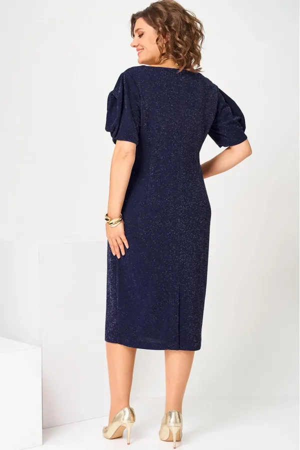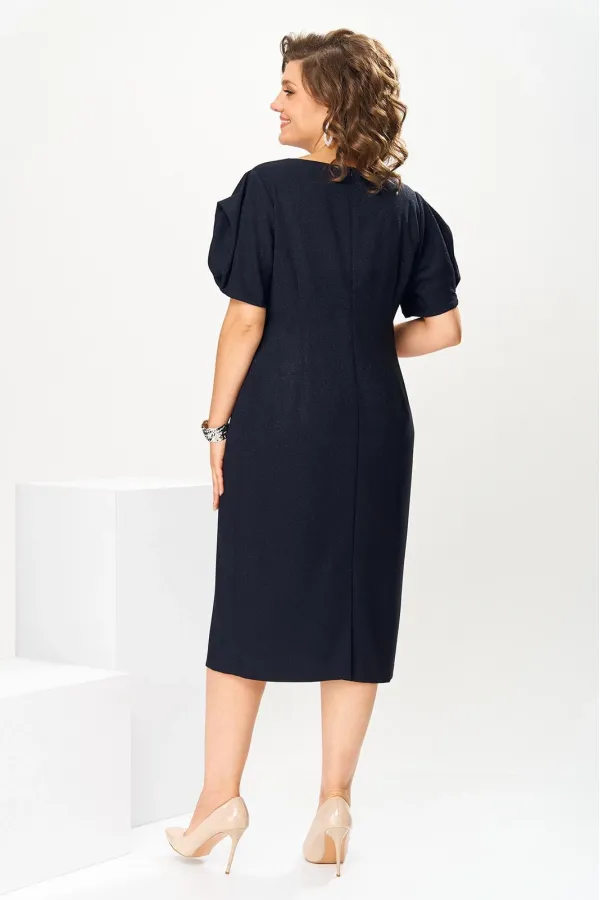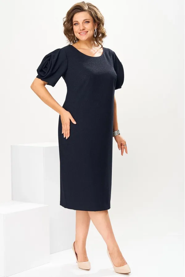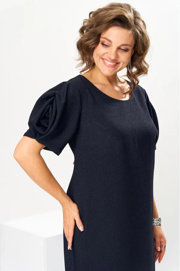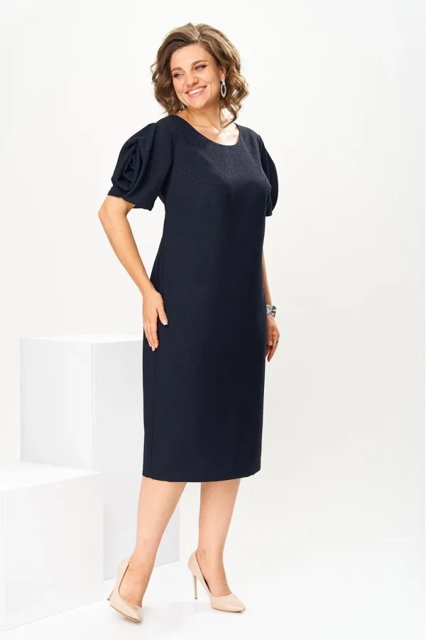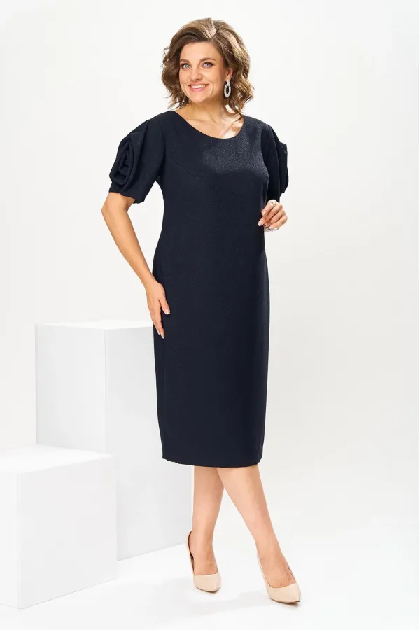 Платье женское, предназначено к нарядной торжественной одежде. Платье женское, полу прилегающего силуэта, длиной ниже колен. Перед с 2-мя нагрудными вытачками. Спинка с 2-мя таллиевыми вытачками, со средним швом, заканчивающимся шлицей. Горловина круглая, обточная, без воротника. Застёжка на потайную тесьму молнию в среднем шве спинки. Рукав втачной одно шовный, короткий, с обтачным низом, на подкладке. Рукав декоррирован цветком. Платье на подкладке. Платье с плечевыми накладками. Длина платья по спинке 110 см, длина рукава 26 см.