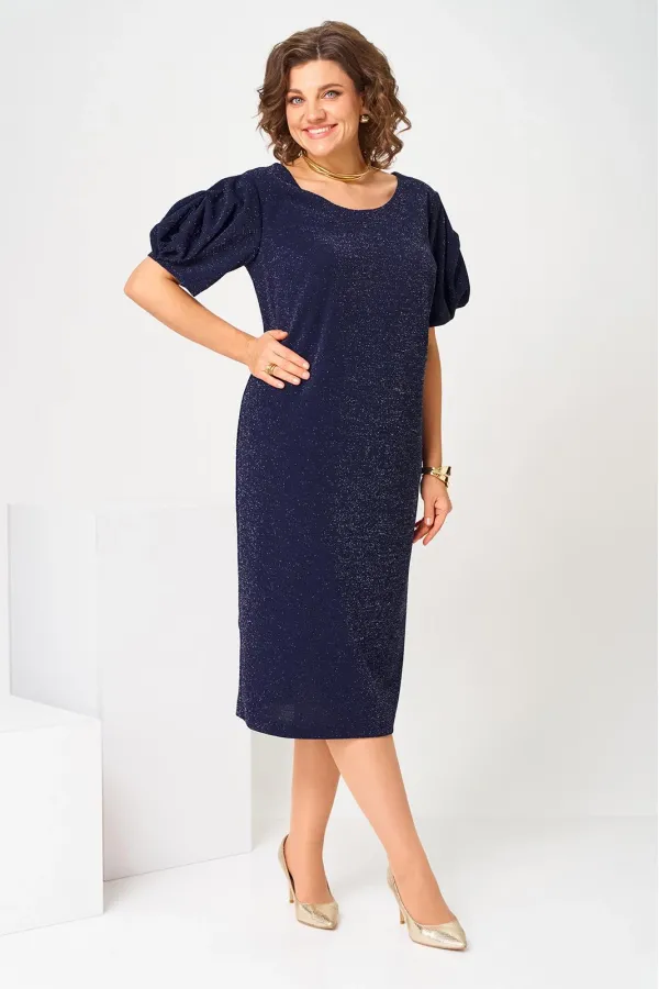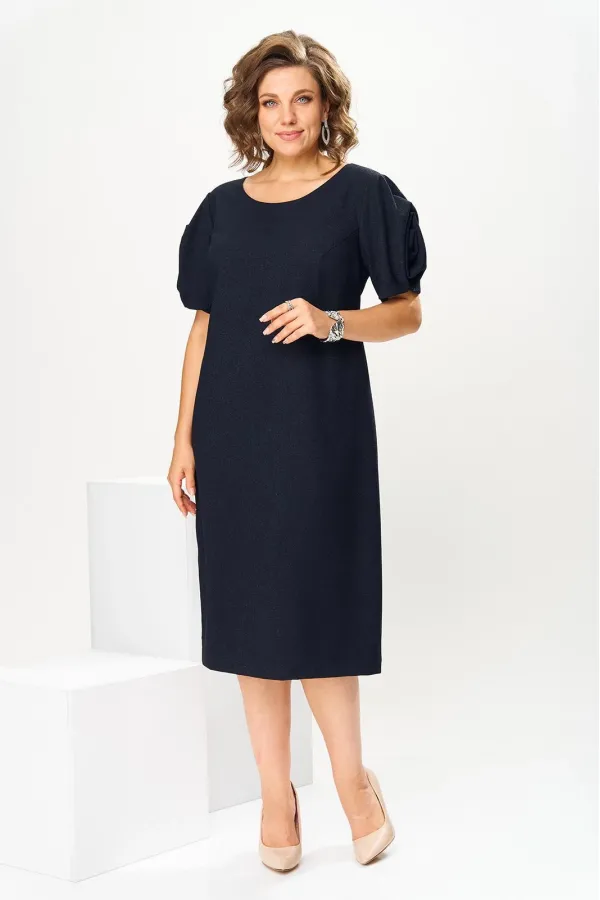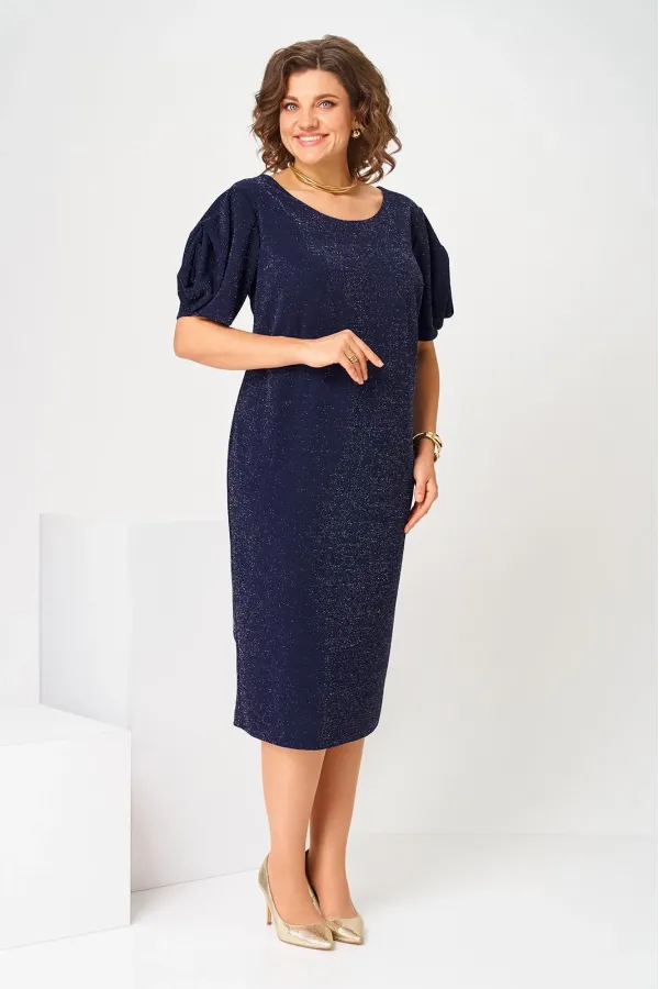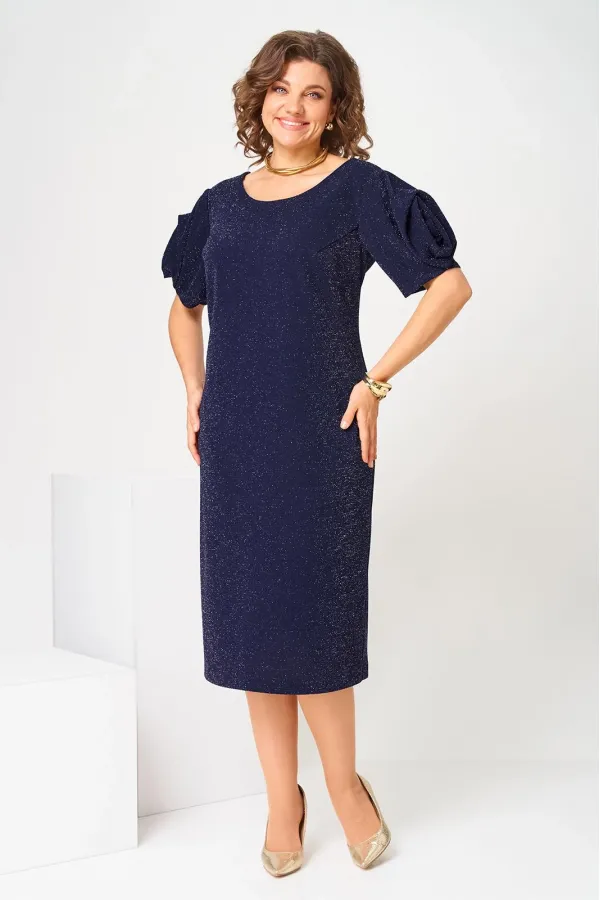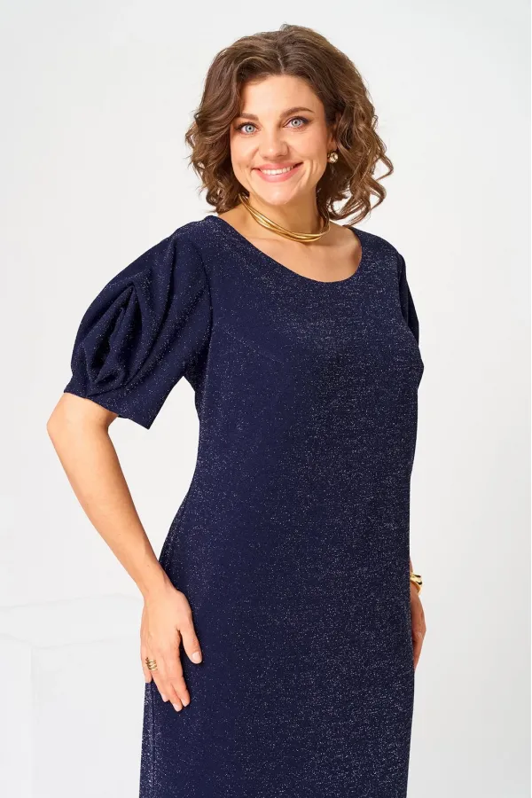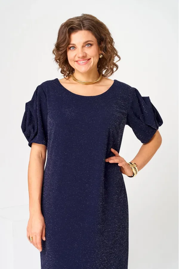 Платье женское, предназначено к нарядной торжественной одежде. Платье женское, полу прилегающего силуэта, длиной ниже колен. Перед с 2-мя нагрудными вытачками. Спинка с 2-мя таллиевыми вытачками, со средним швом, заканчивающимся шлицей. Горловина круглая, обточная, без воротника. Застёжка на потайную тесьму молнию в среднем шве спинки. Рукав втачной одно шовный, короткий, с обтачным низом, на подкладке. Рукав декоррирован цветком. Платье на подкладке. Платье с плечевыми накладками. Длина платья по спинке 110 см, длина рукава 26 см.