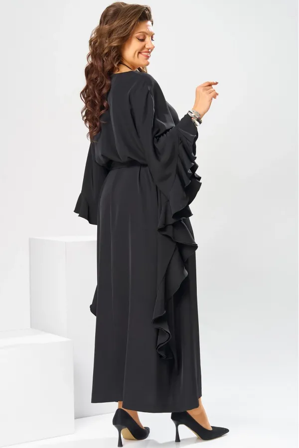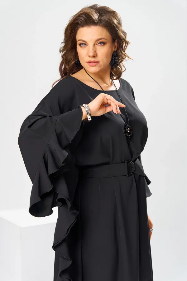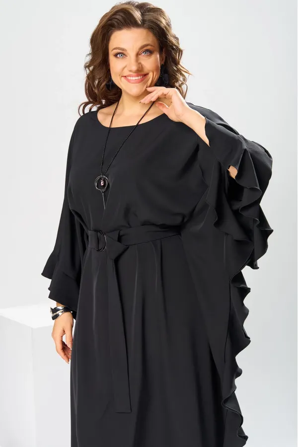 Платье женское, относится к нарядной торжественной одежде. Платье пончо свободного кроя, длинное. Перед цельнокроеный. Спинка со средним швом, вверху с разрезом, фиксирующимся по горловине на 1-ну навесную петлю и 1-ну пришивную пуговицу. Горловина круглая, обточная, без воротника, по переду горловины отделочная строчка 0,6 см. Рукав цельнокроеный удлинённый. Низ рукава и боковые швы декорированы приточной оборкой. По боковым швам зафиксирован уровень пройм и место расположения петель на уровне линии талии отделочными строчками. К платью прилагается съёмный пояс с пряжкой, фиксируемые на платье в петли на уровне линии талии. Платье без плечевых накладок. Длина спинки платья 132 см, ширина на уровне глубины проймы 66 см, ширина по линии талии 66 см, ширина плеча+длина рукава 56,5 см.